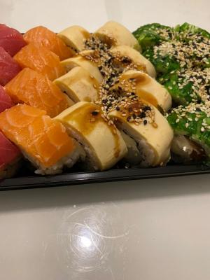Состав: филе лосося, угорь, креветка тигровая, авокадо, огурец, сыр, рис, нори