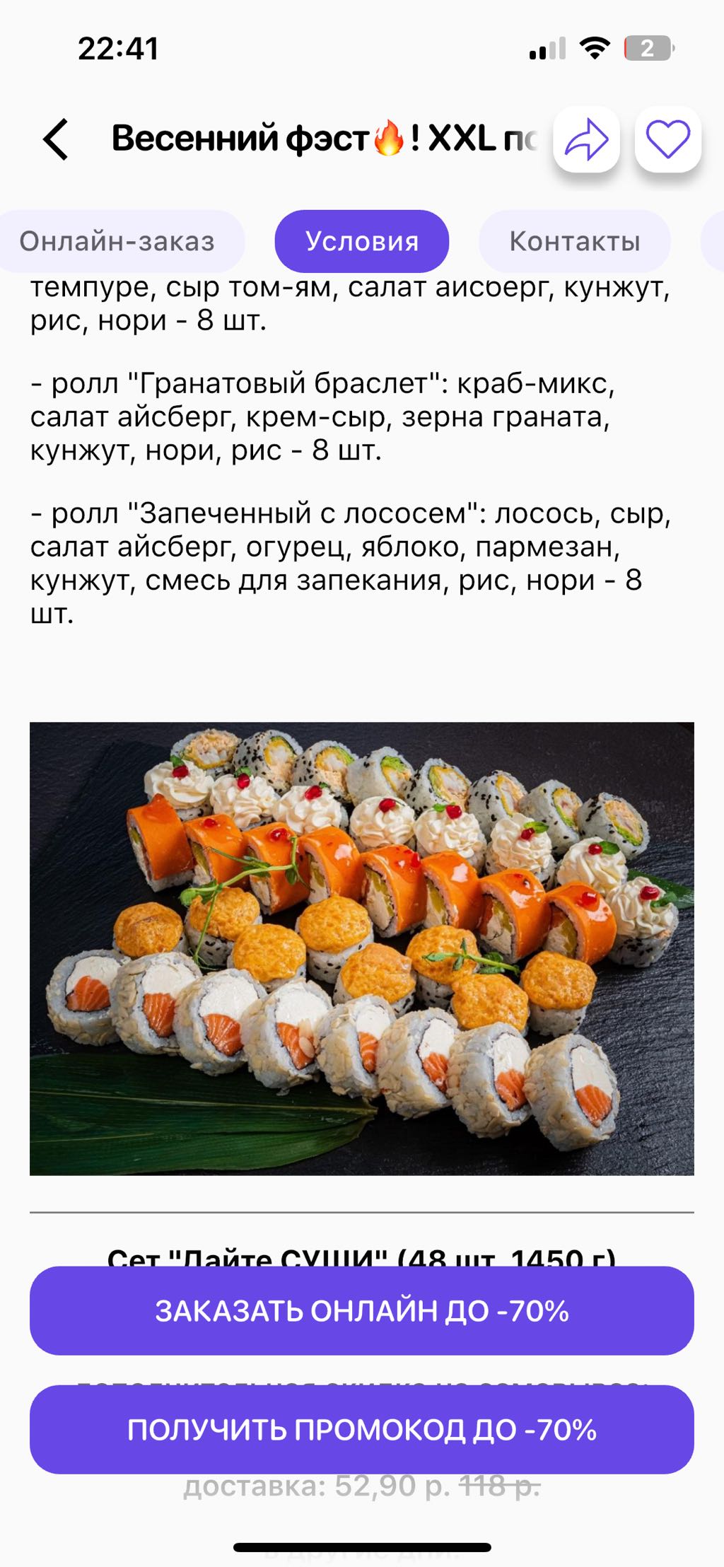 - Промокод дает право на скидку до 67% на суши-сеты от "ArtSushi"