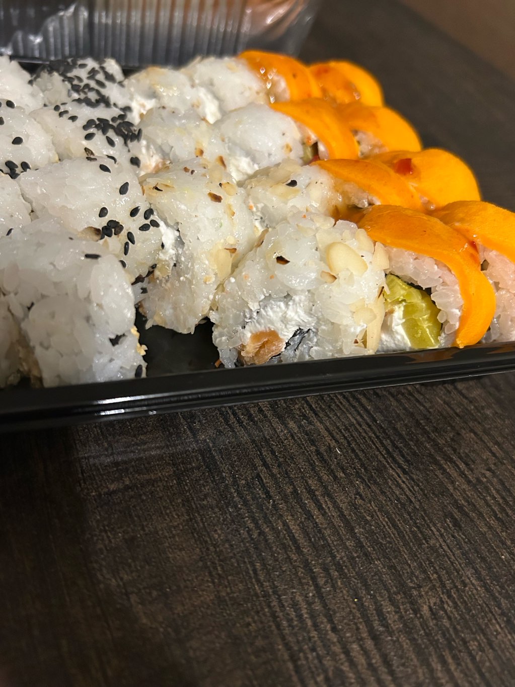 Состав: тунец, такуан, сыр, нори, рис, темпура