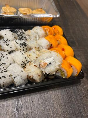 Состав: филе лосося, угорь, креветка тигровая, авокадо, огурец, сыр, рис, нори