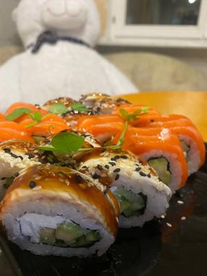 Состав: филе угря, авокадо, огурец, сыр, рис, соус терияки, кунжут