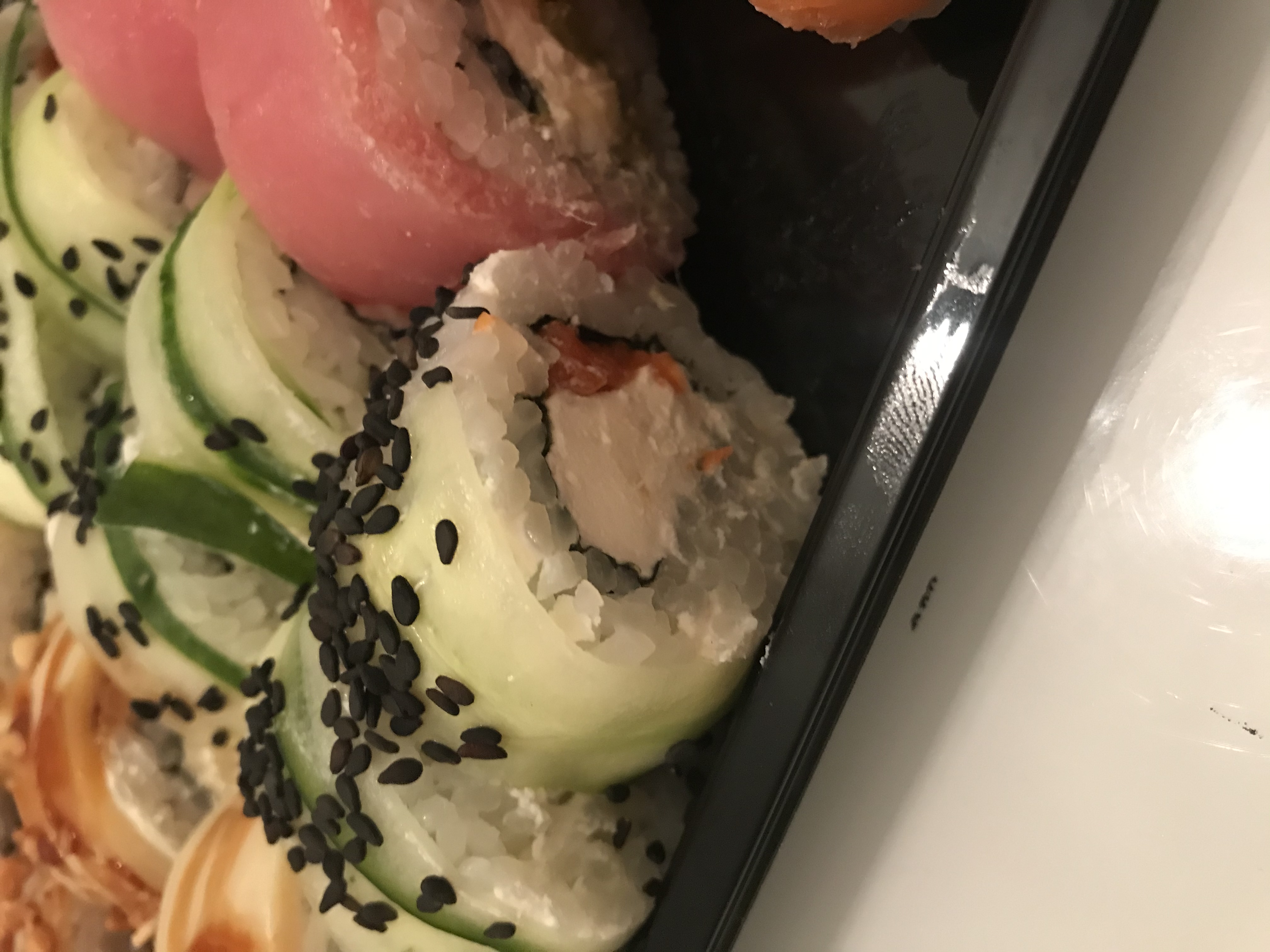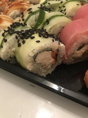 Состав: филе угря, авокадо, огурец, сыр, рис, соус терияки, кунжут