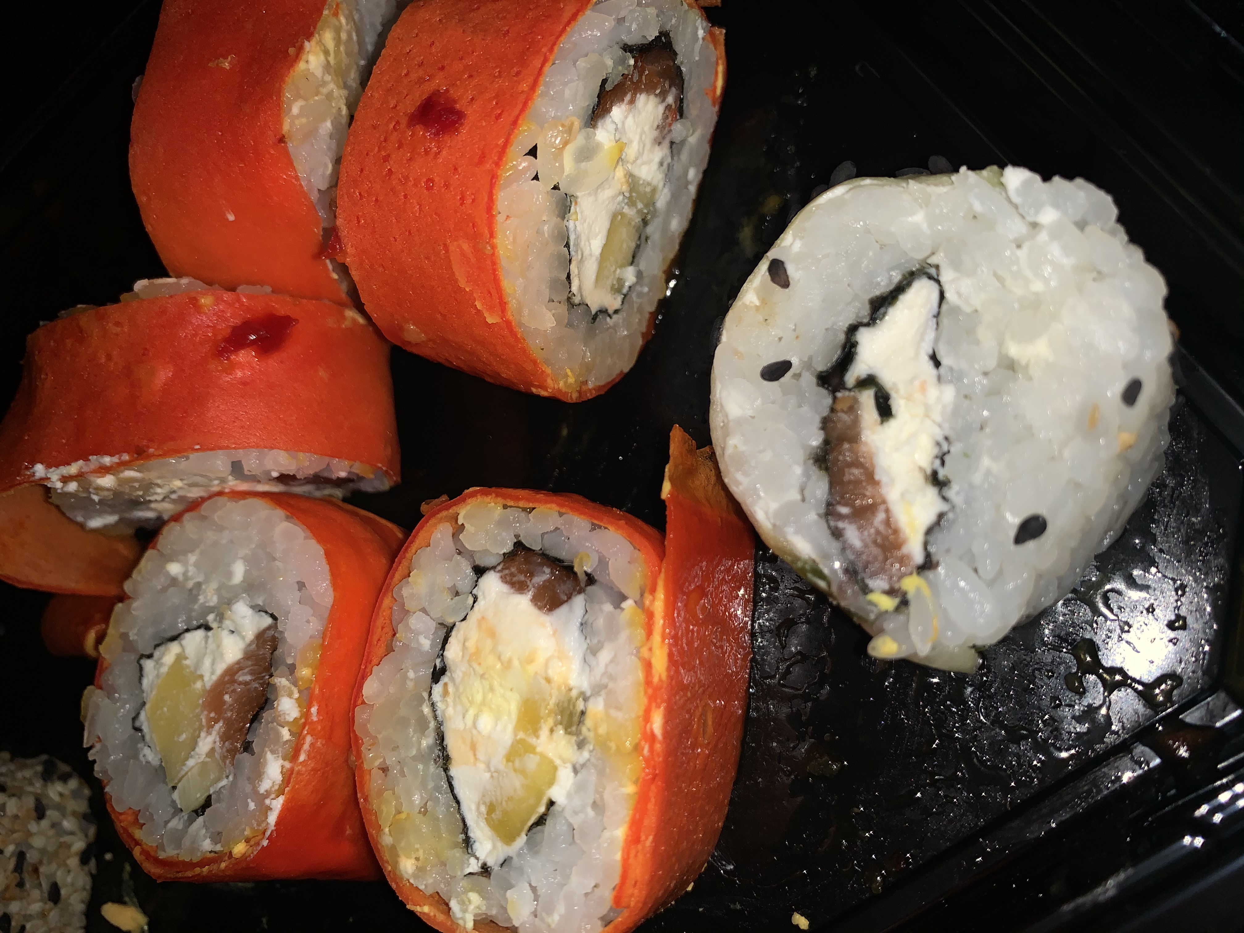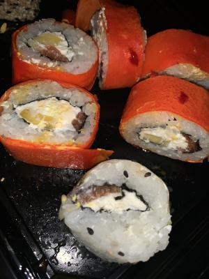 - ролл "Крем-шитаке в японском блинчике": грибы шиитаке, обжаренные в соусе терияки, крем-чиз, японский блинчик оранж, такуан, соус терияки, арахис, нори, рис - 8 шт.