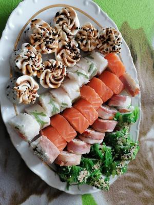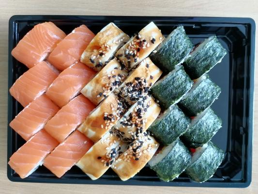 Состав: филе лосося, угорь, креветка тигровая, авокадо, огурец, сыр, рис, нори
