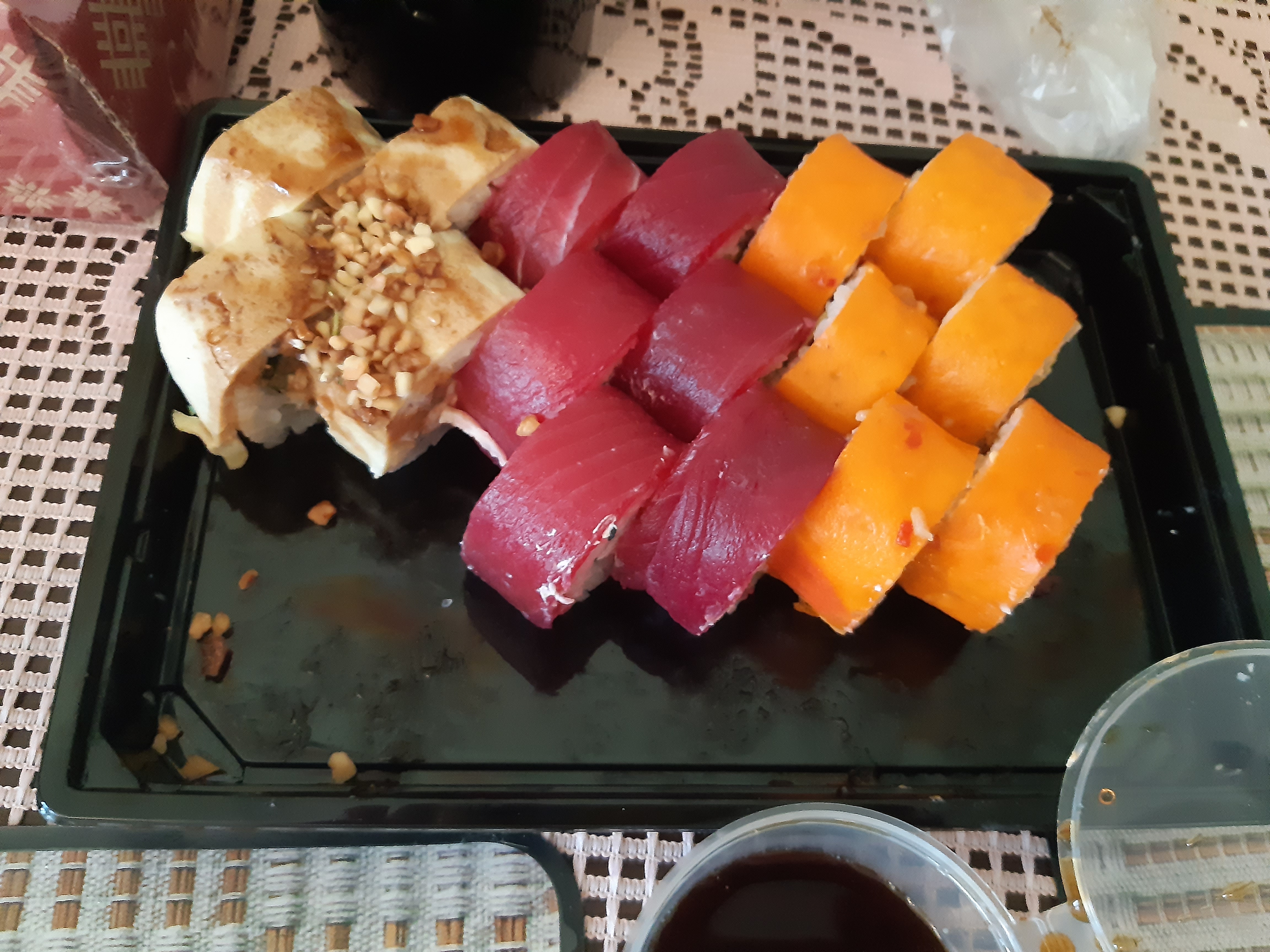 Состав: тунец, такуан, сыр, нори, рис, темпура