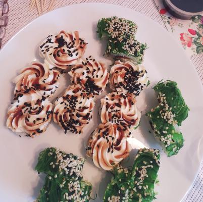 - ролл "Крем-шитаке в японском блинчике": грибы шиитаке, обжаренные в соусе терияки, крем-чиз, японский блинчик оранж, такуан, соус терияки, арахис, нори, рис - 8 шт.