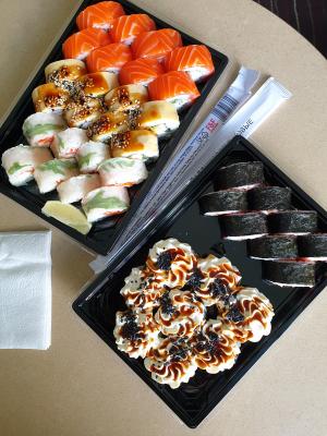 - гарнир: имбирь (25 г), соевый соус (40 мл), васаби (15 г) в подарок!
