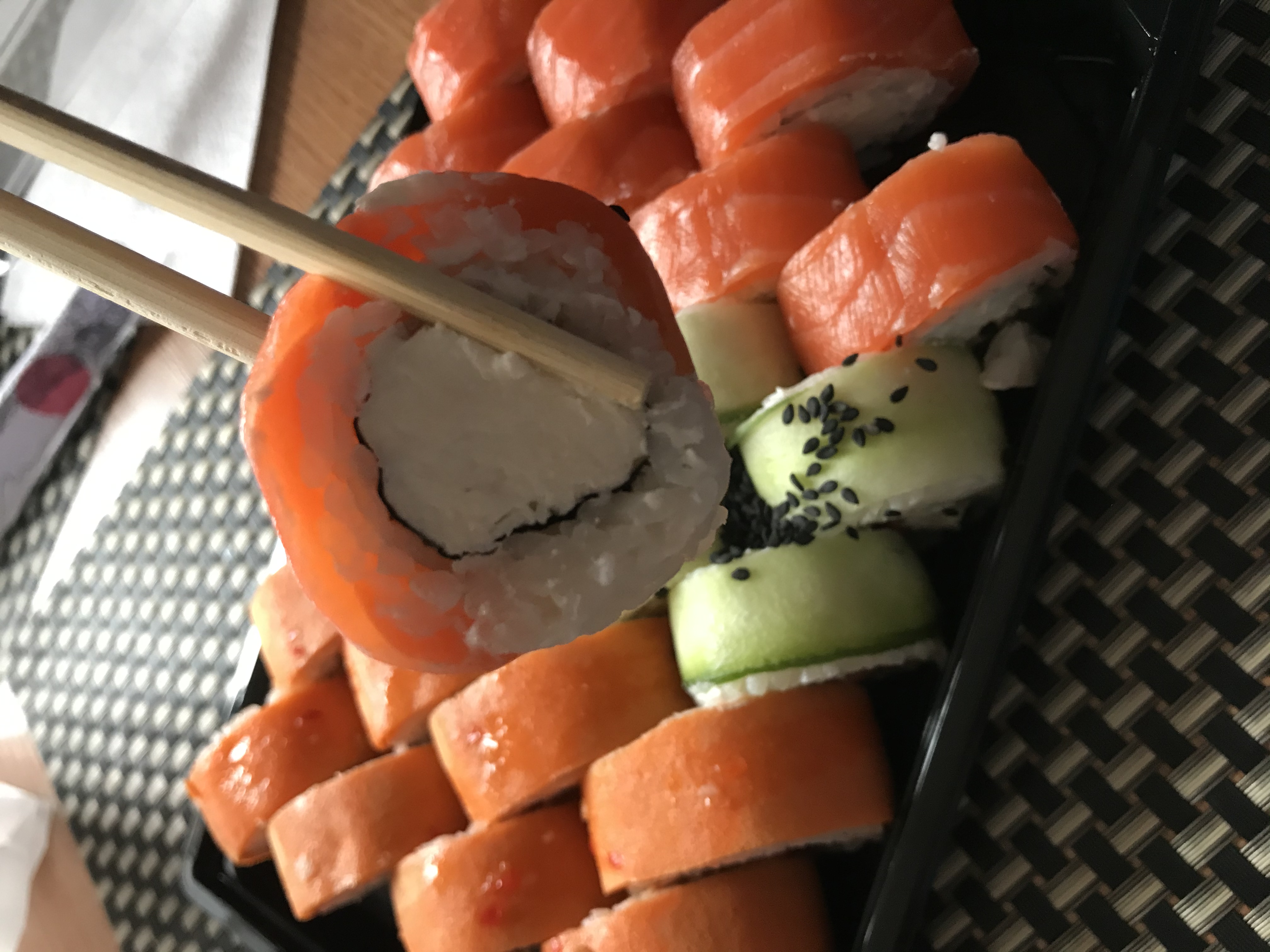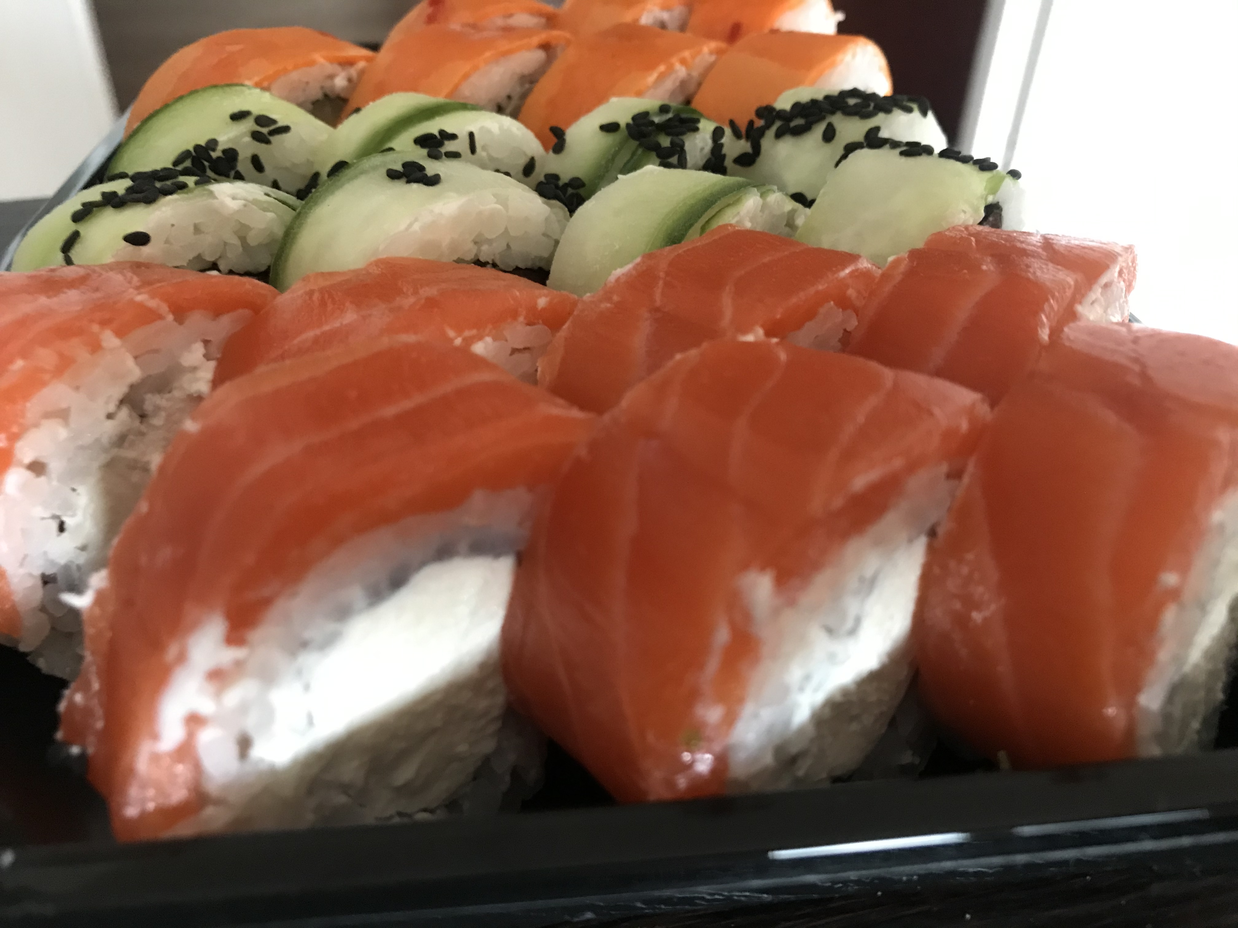 Состав: филе лосося, огурец, сыр, рис, нори