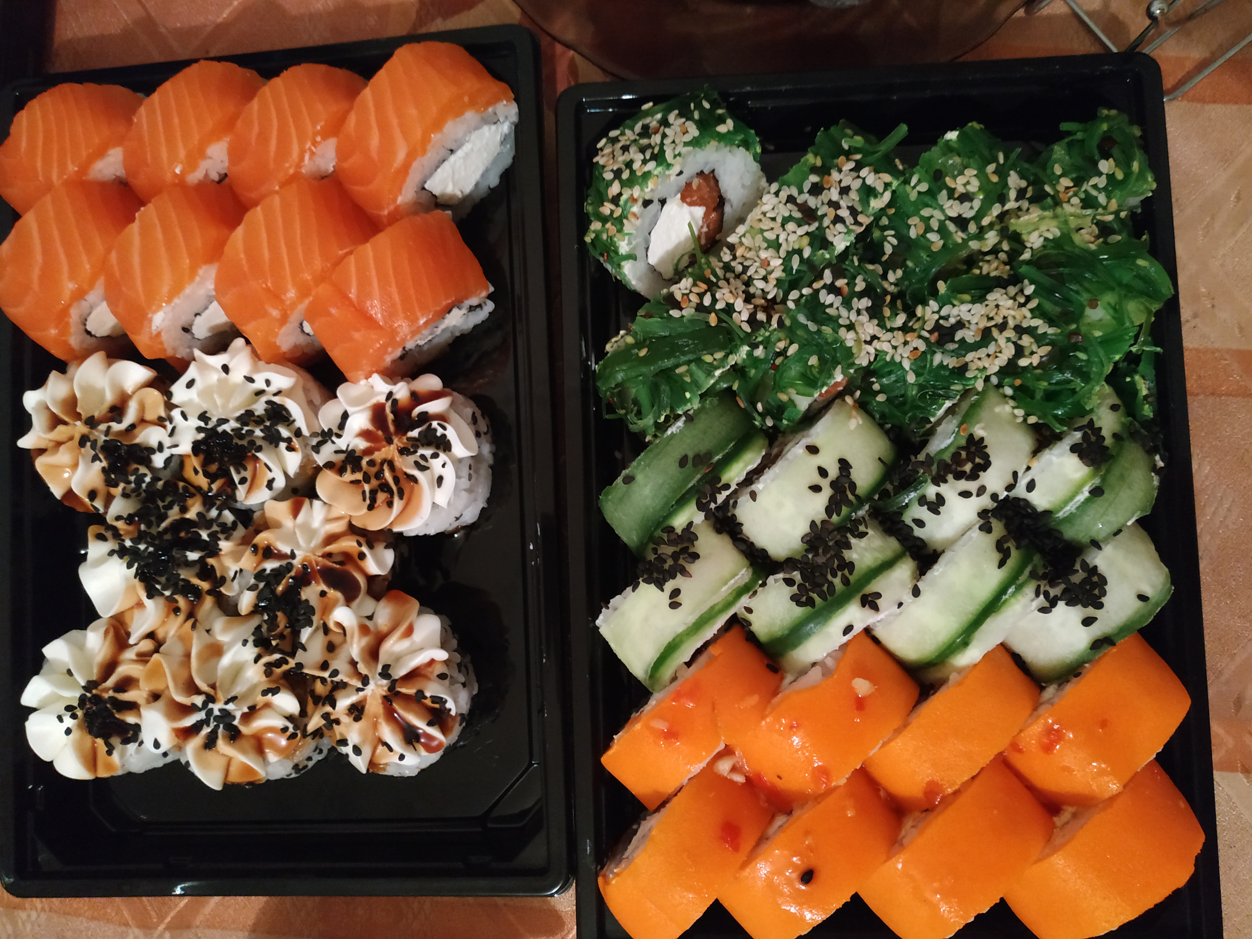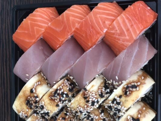 Состав: филе лосося, угорь, креветка тигровая, авокадо, огурец, сыр, рис, нори
