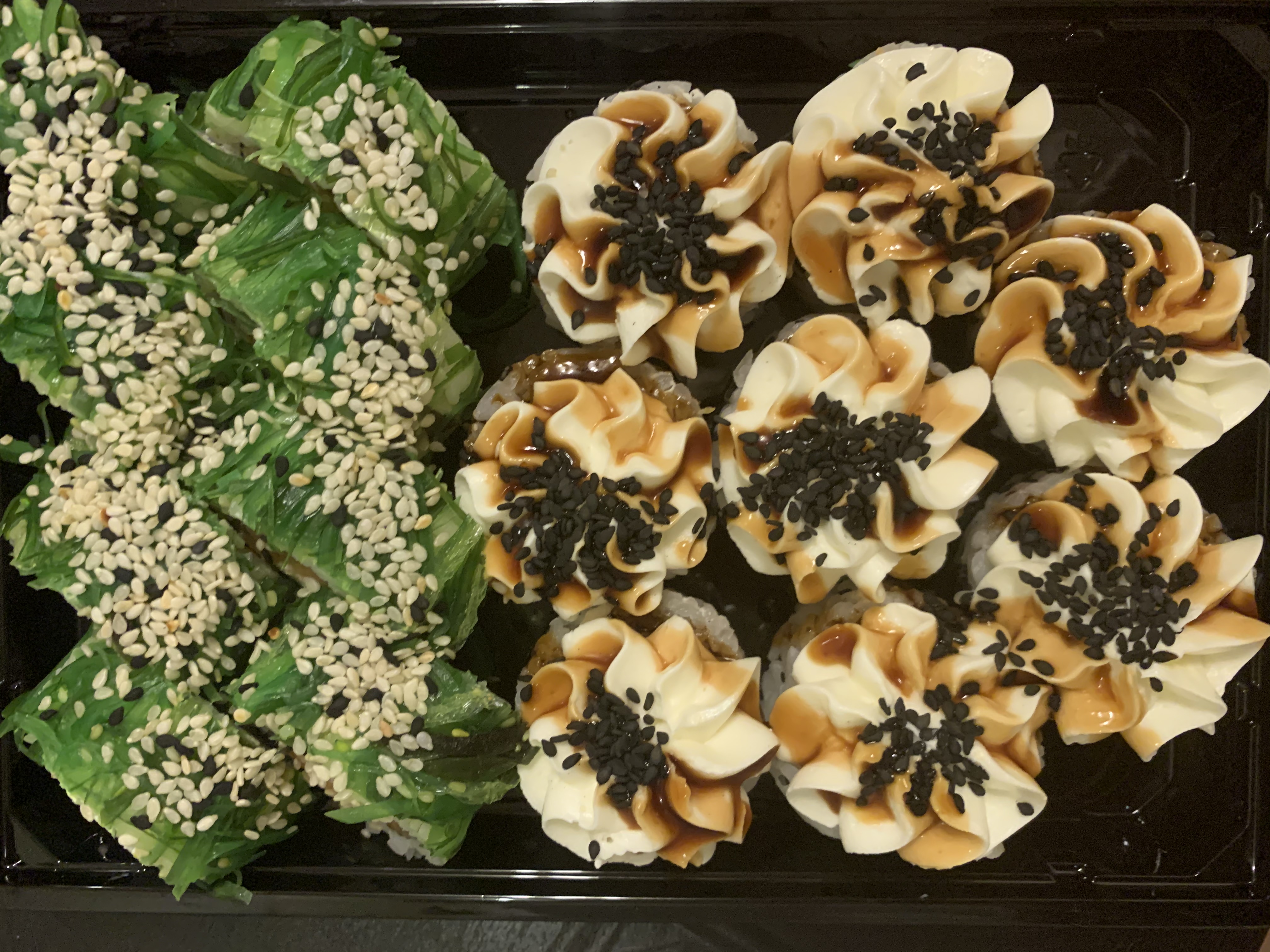 - ролл "Грин Эби Кроунинг": креветка тигровая, краб-микс, чука-салат, сыр, кунжут, нори, рис - 8 шт.