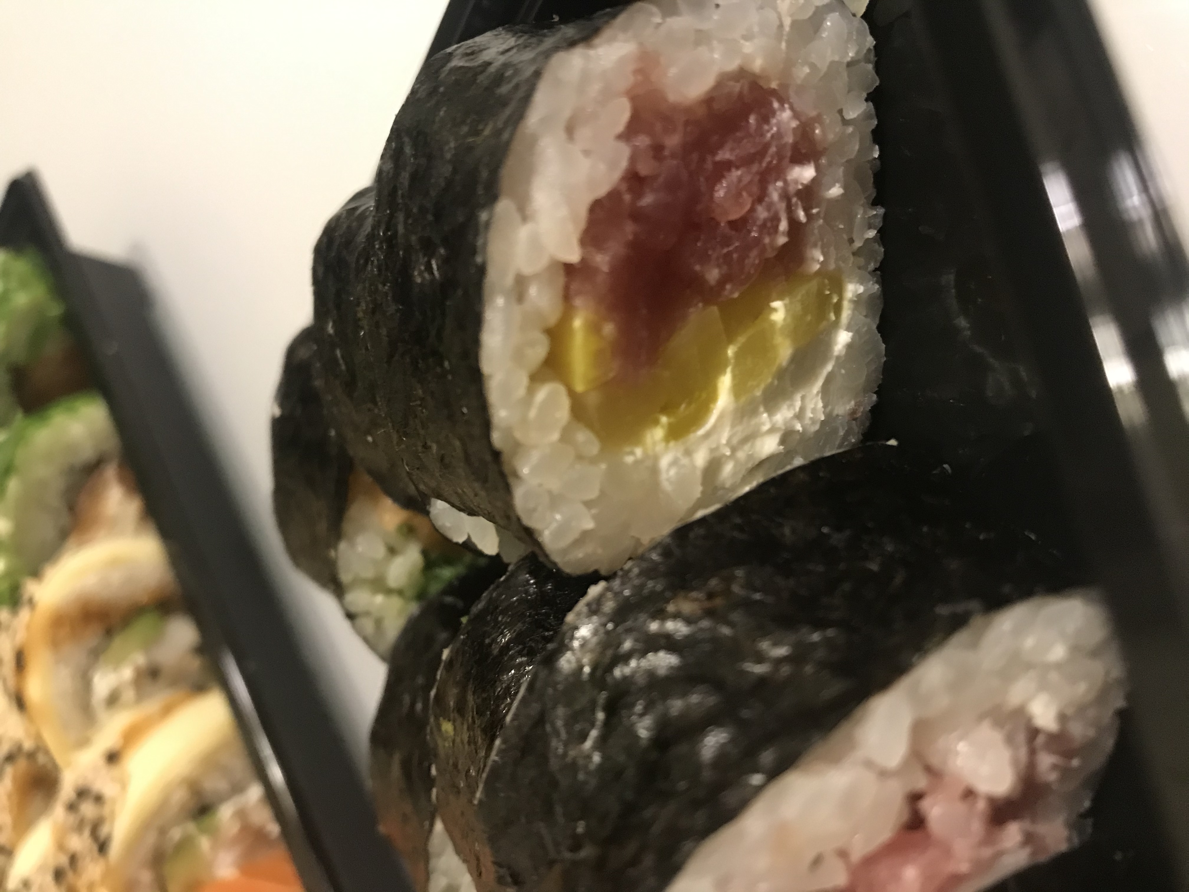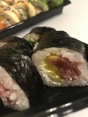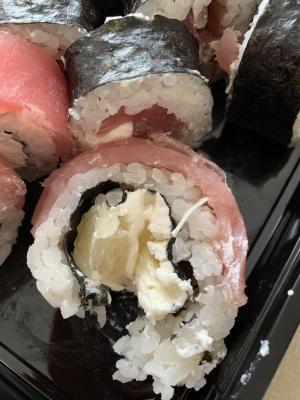 Состав: тунец, такуан, сыр, нори, рис, темпура