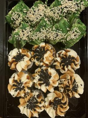 - ролл "Крем-шитаке в японском блинчике": грибы шиитаке, обжаренные в соусе терияки, крем-чиз, японский блинчик оранж, такуан, соус терияки, арахис, нори, рис - 8 шт.