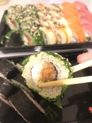 Состав: филе лосося, угорь, креветка тигровая, авокадо, огурец, сыр, рис, нори