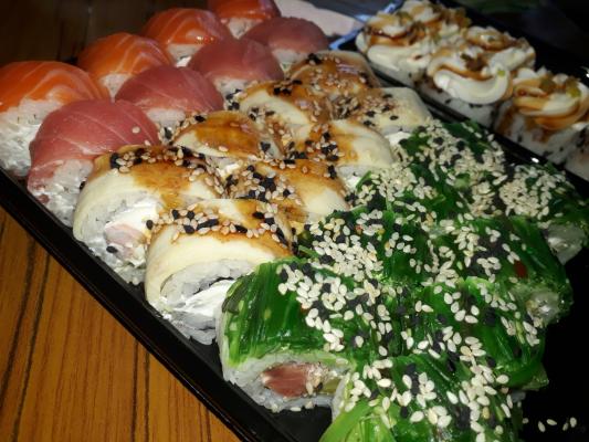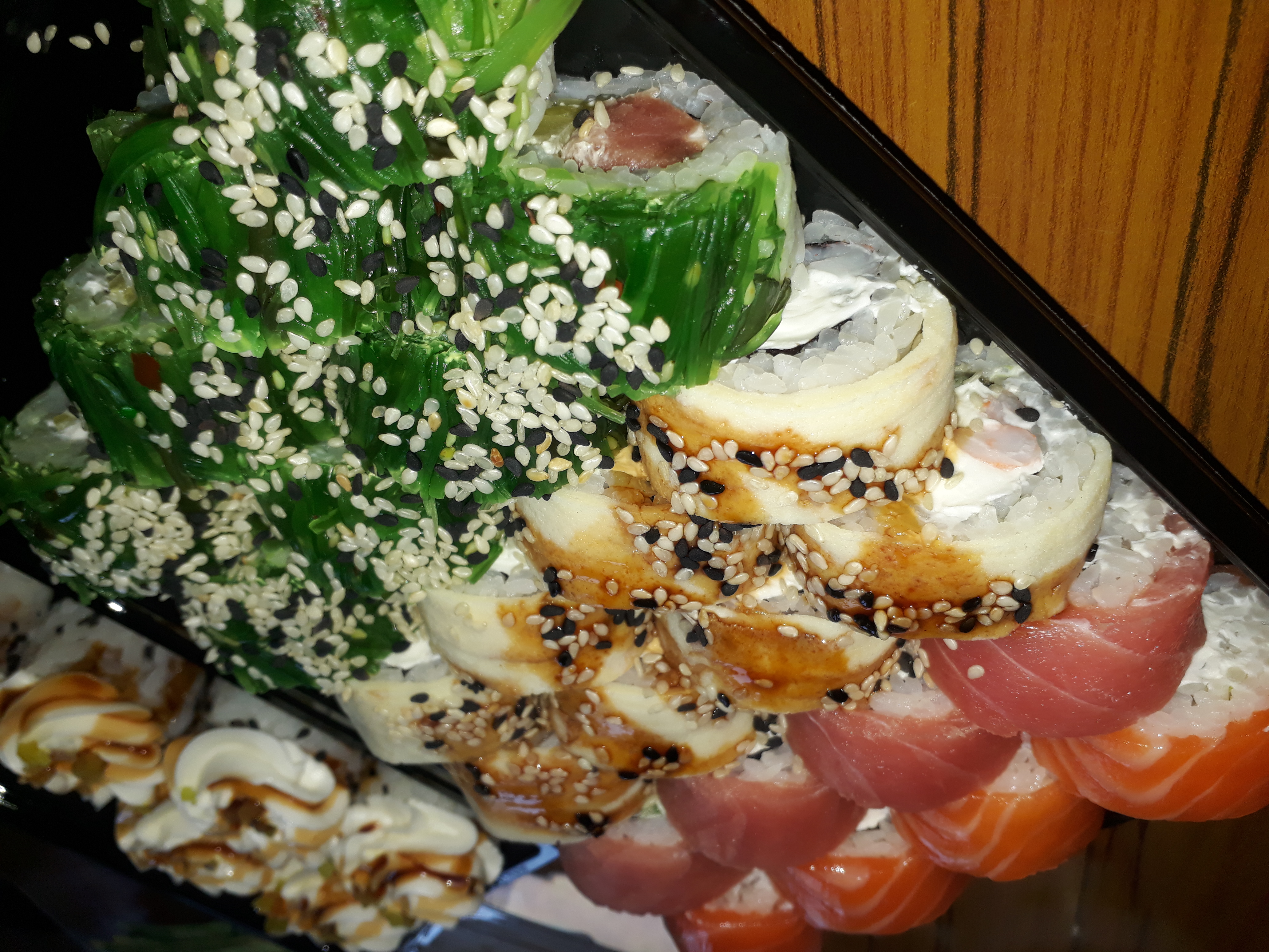 Состав: филе лосося, угорь, креветка тигровая, авокадо, огурец, сыр, рис, нори