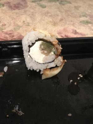 - ролл "Крем-шитаке в японском блинчике": грибы шиитаке, обжаренные в соусе терияки, крем-чиз, японский блинчик оранж, такуан, соус терияки, арахис, нори, рис - 8 шт.