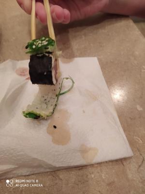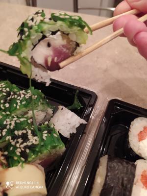 Состав: тунец, такуан, сыр, нори, рис, темпура