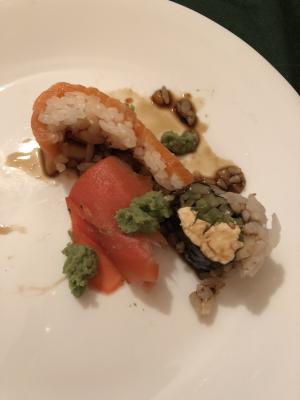 - ролл "Крем-шитаке в японском блинчике": грибы шиитаке, обжаренные в соусе терияки, крем-чиз, японский блинчик оранж, такуан, соус терияки, арахис, нори, рис - 8 шт.