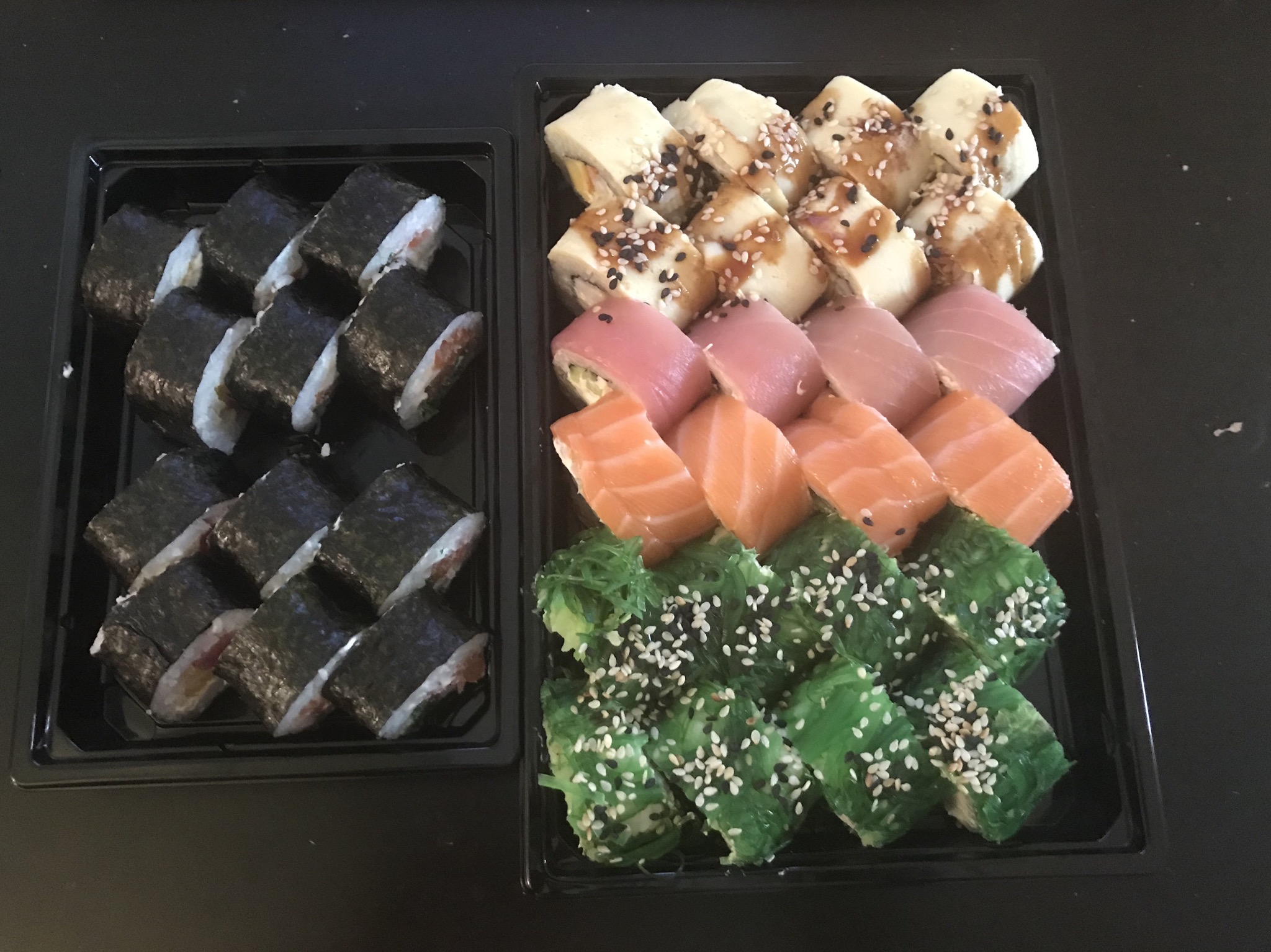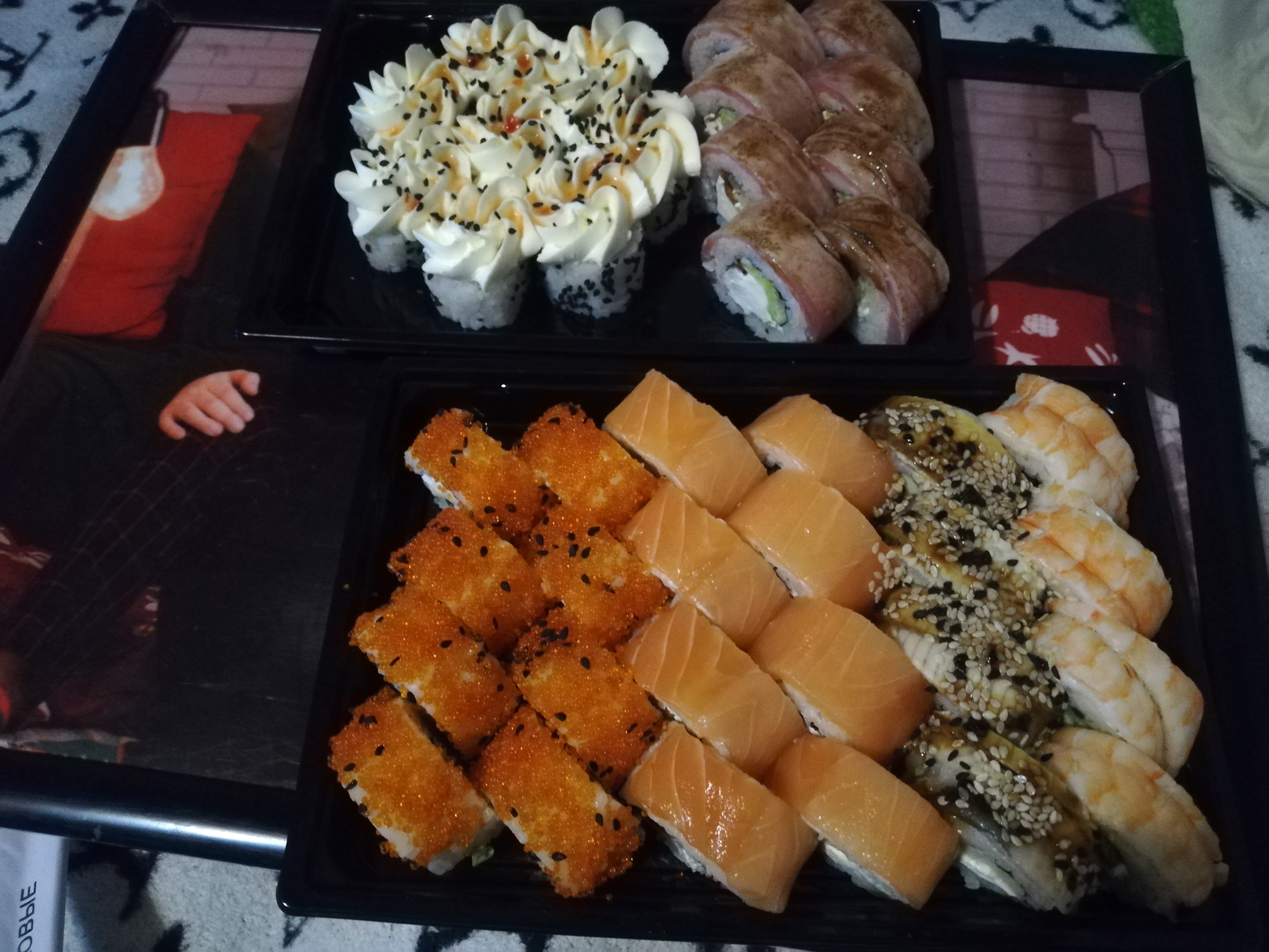 Состав: филе лосося, угорь, креветка тигровая, авокадо, огурец, сыр, рис, нори