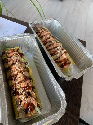 - ролл «В опаленном беконе с тунцом»: тунец, салат айсберг, сыр, бекон опаленный, соус терияки, кунжут, нори, рис – 8 шт.