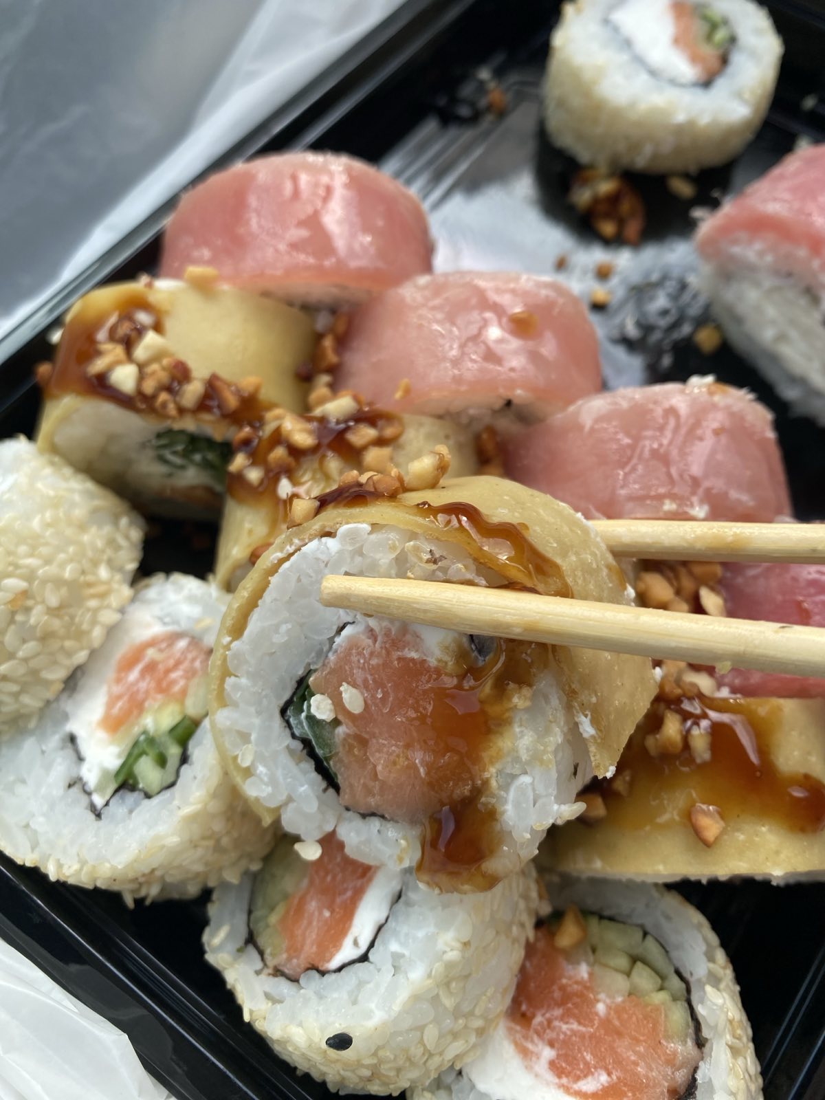 - ролл «В опаленном беконе с тунцом»: тунец, салат айсберг, сыр, бекон опаленный, соус терияки, кунжут, нори, рис – 8 шт.