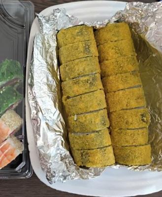 - ролл "Крем-шитаке в японском блинчике": грибы шиитаке, обжаренные в соусе терияки, крем-чиз, японский блинчик оранж, такуан, соус терияки, арахис, нори, рис - 8 шт.