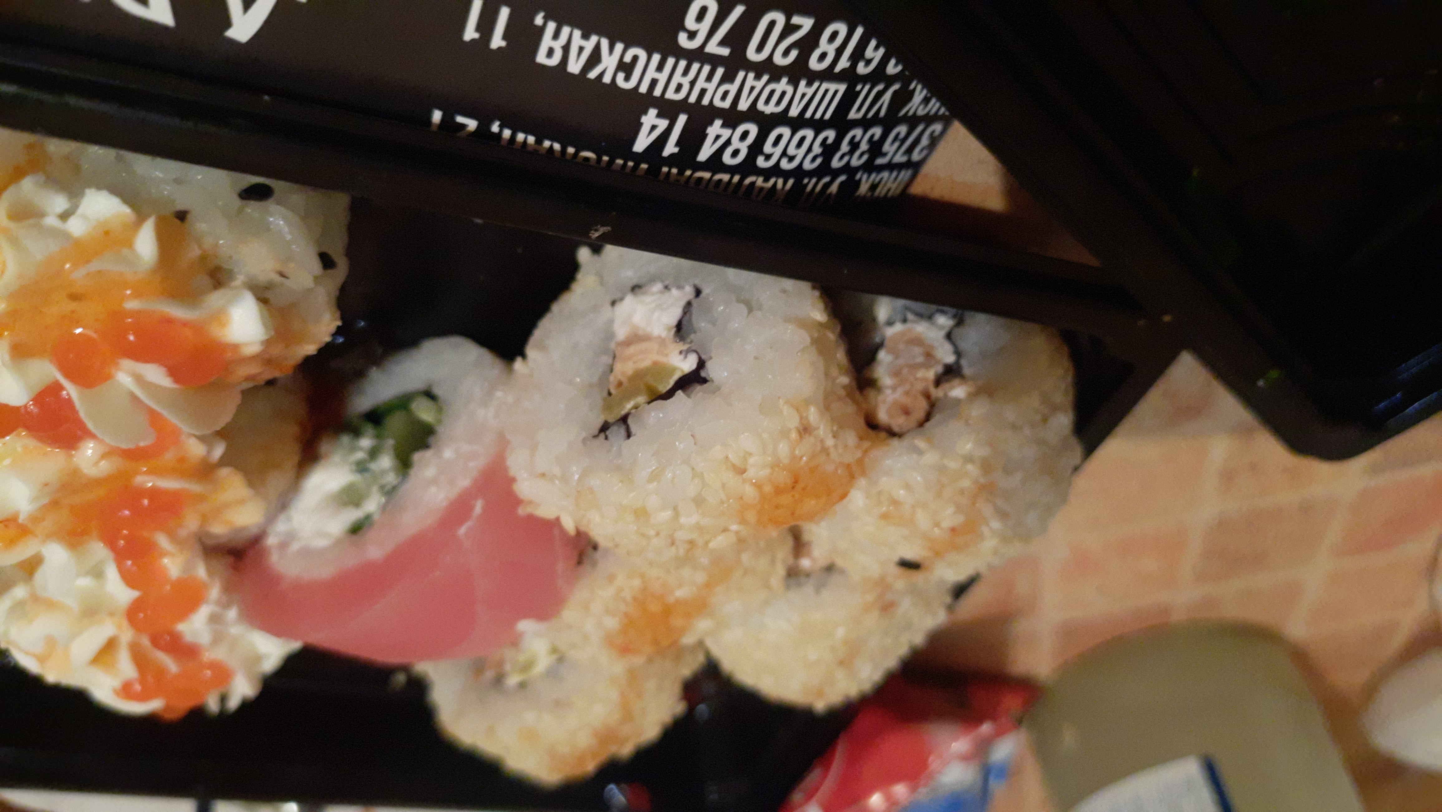 Состав: тунец, такуан, сыр, нори, рис, темпура