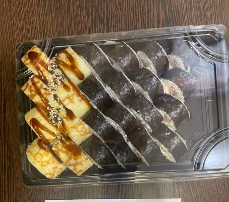 - ролл "Крем-шитаке в японском блинчике": грибы шиитаке, обжаренные в соусе терияки, крем-чиз, японский блинчик оранж, такуан, соус терияки, арахис, нори, рис - 8 шт.