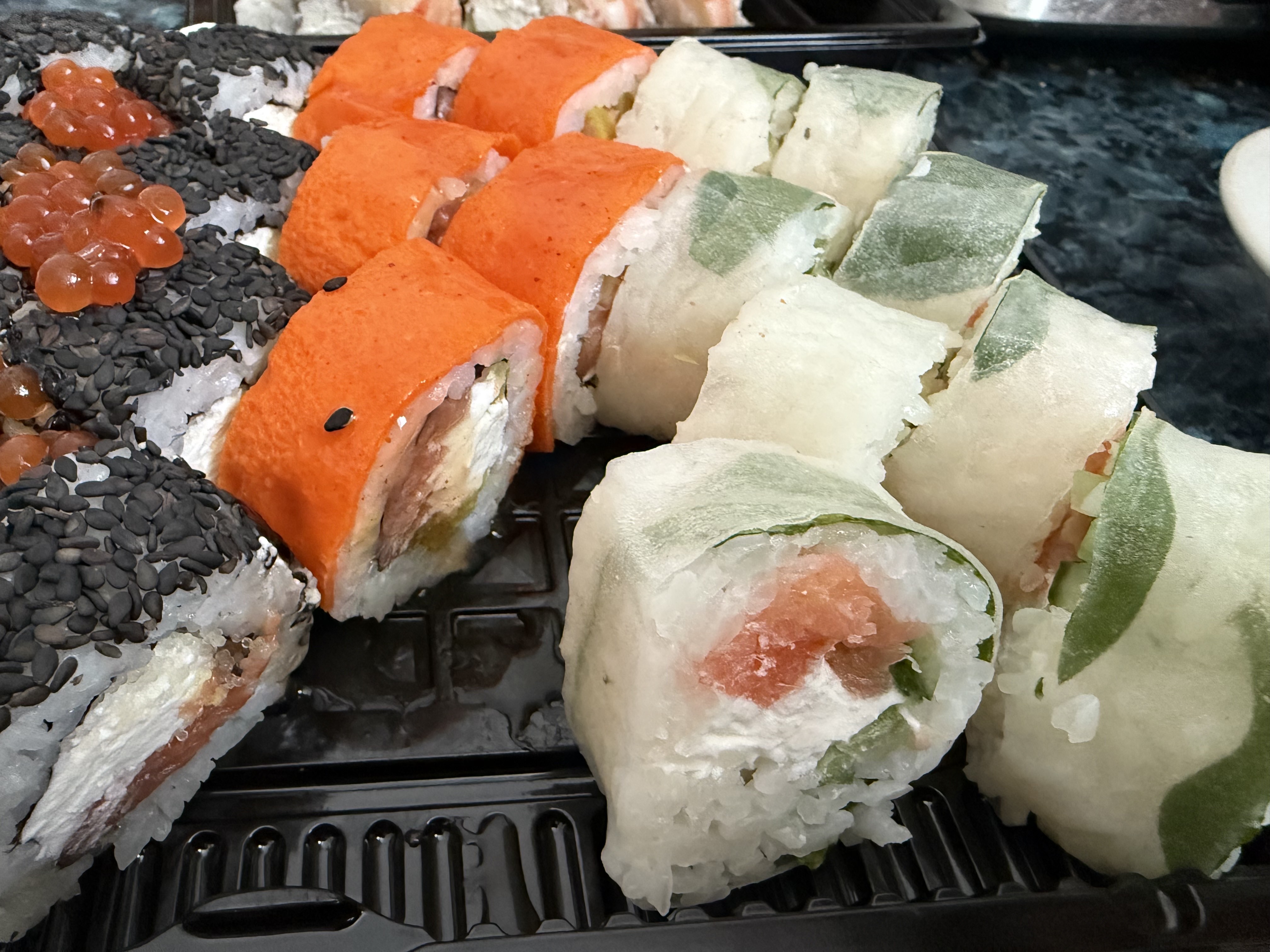 Состав: филе лосося, угорь, креветка тигровая, авокадо, огурец, сыр, рис, нори
