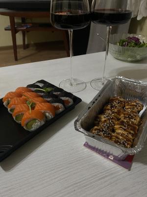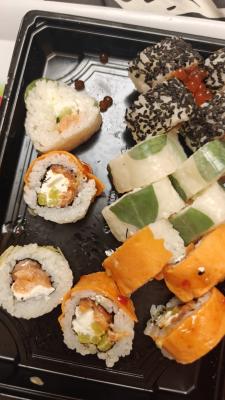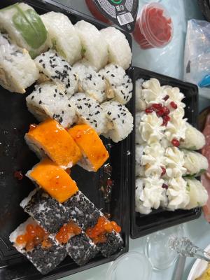 - гарнир: имбирь (40 г), соевый соус (40 мл), васаби (15 г) в подарок!
