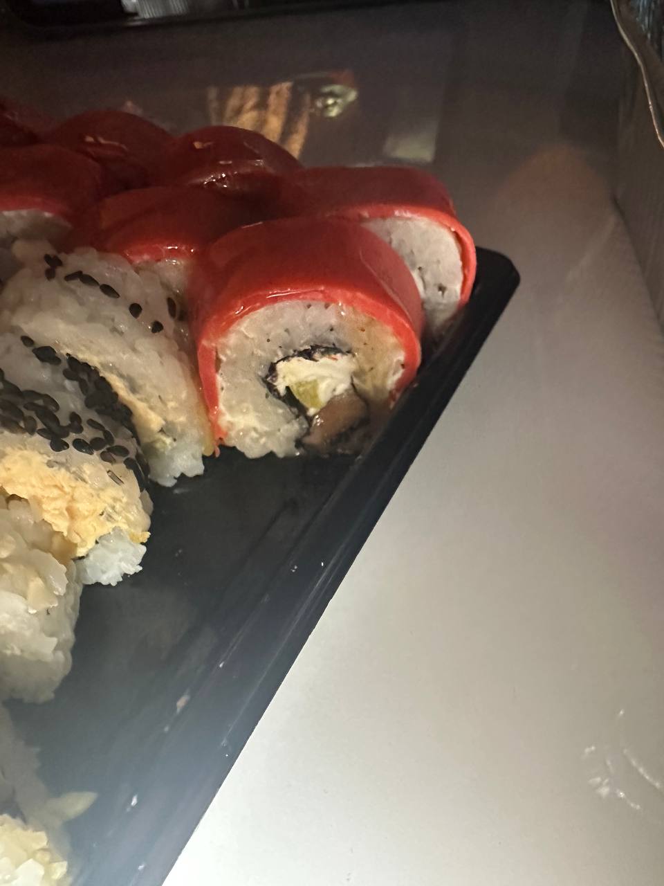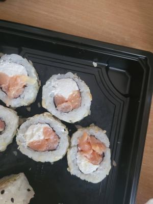 Состав: тунец, такуан, сыр, нори, рис, темпура