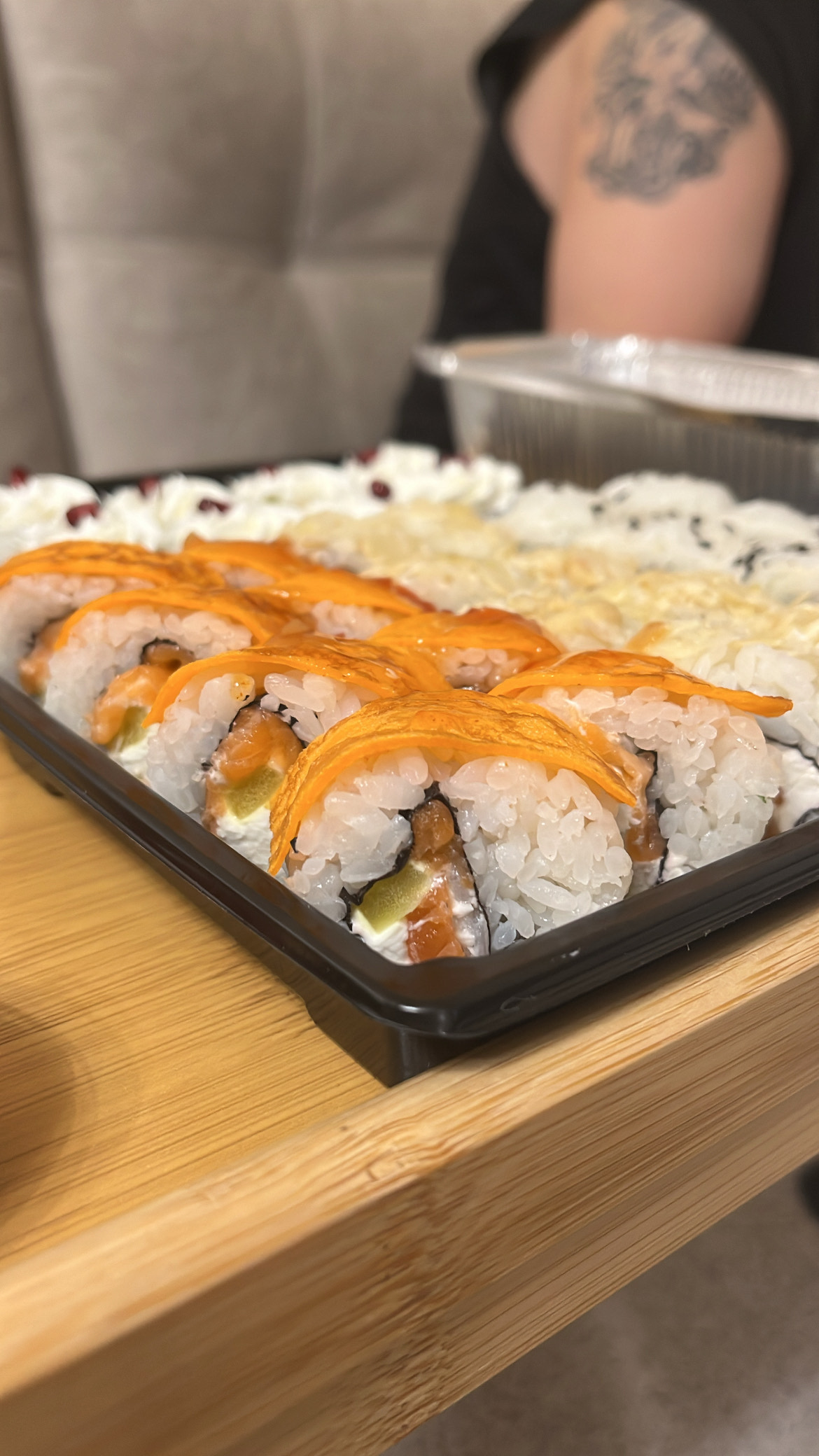 Состав: филе лосося, угорь, креветка тигровая, авокадо, огурец, сыр, рис, нори