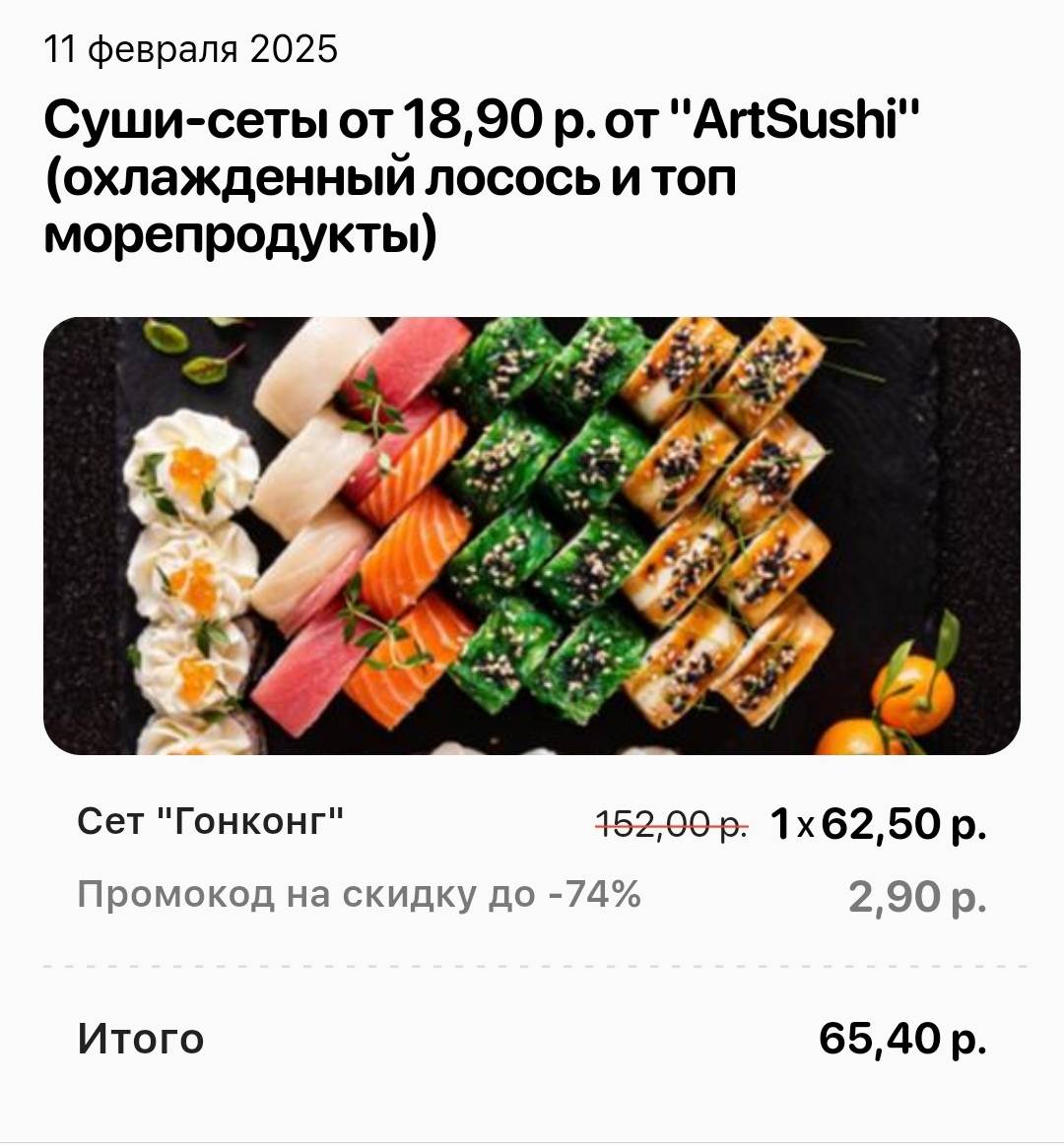 - Промокод дает право на скидку до 67% на суши-сеты от "ArtSushi"