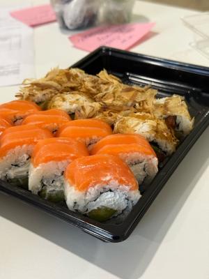 Состав: тунец, такуан, сыр, нори, рис, темпура
