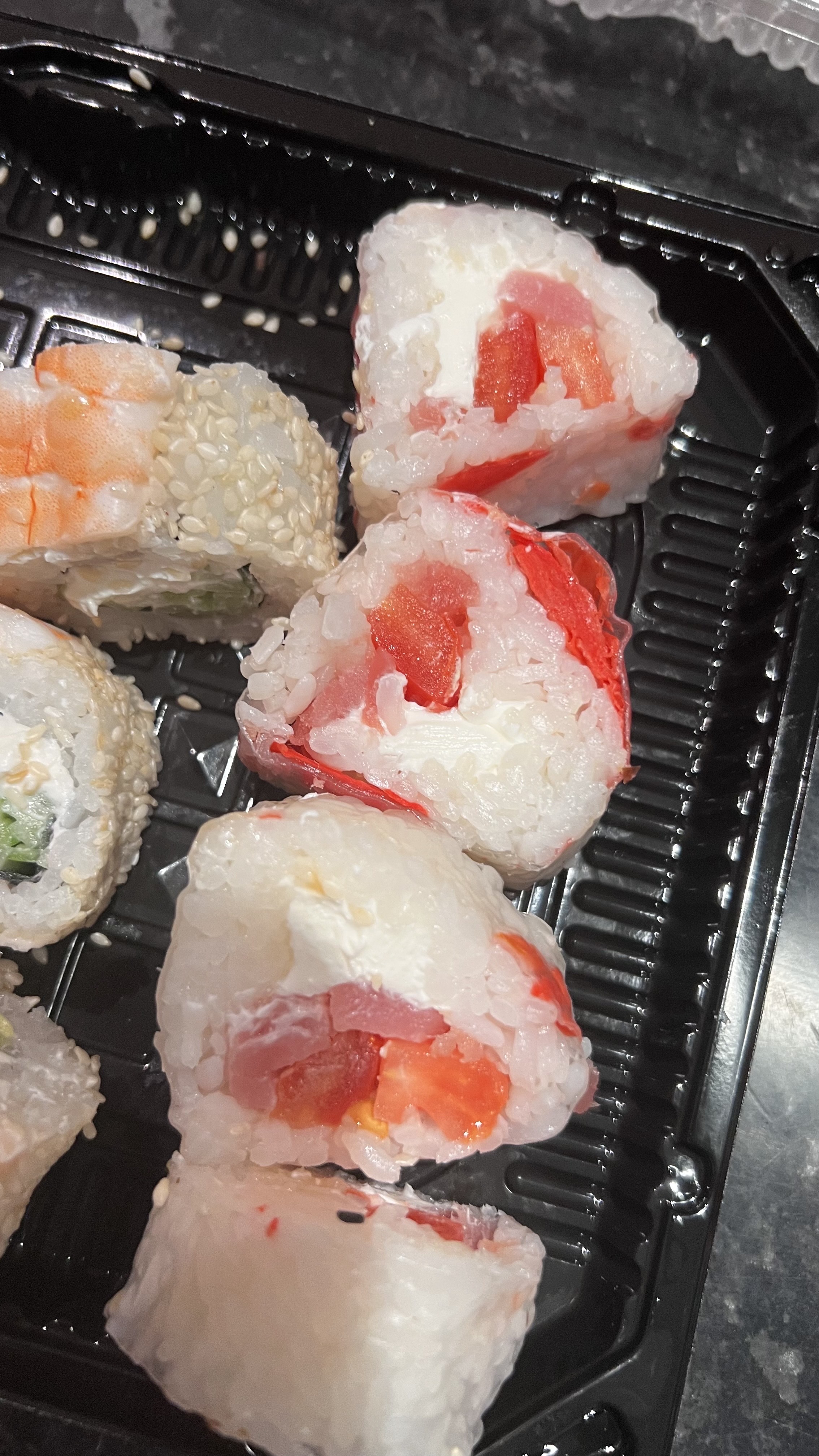 Состав: тунец, такуан, сыр, нори, рис, темпура