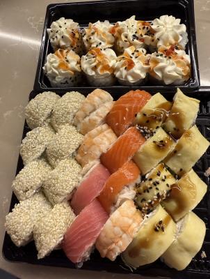 Состав: филе лосося, угорь, креветка тигровая, авокадо, огурец, сыр, рис, нори