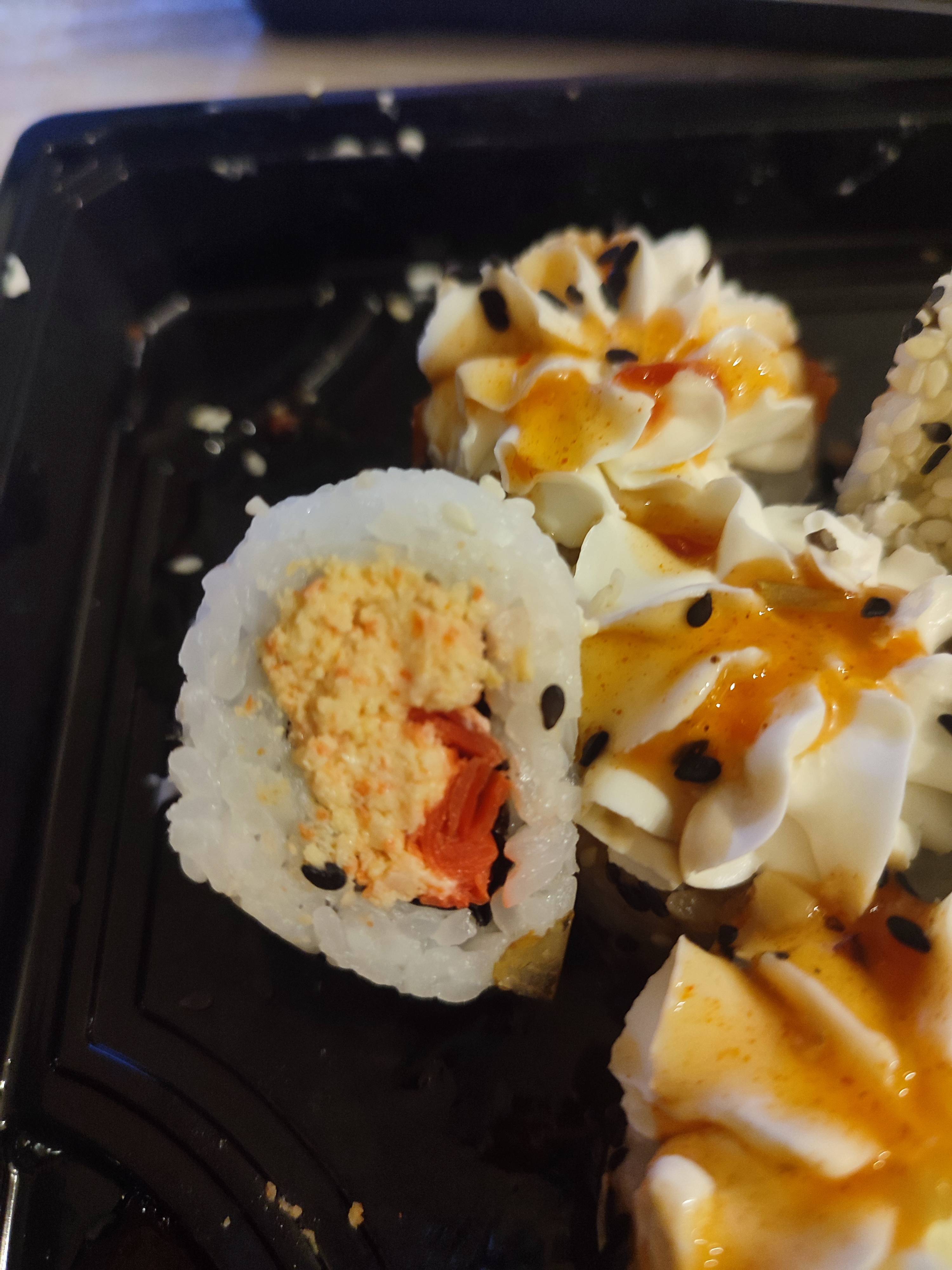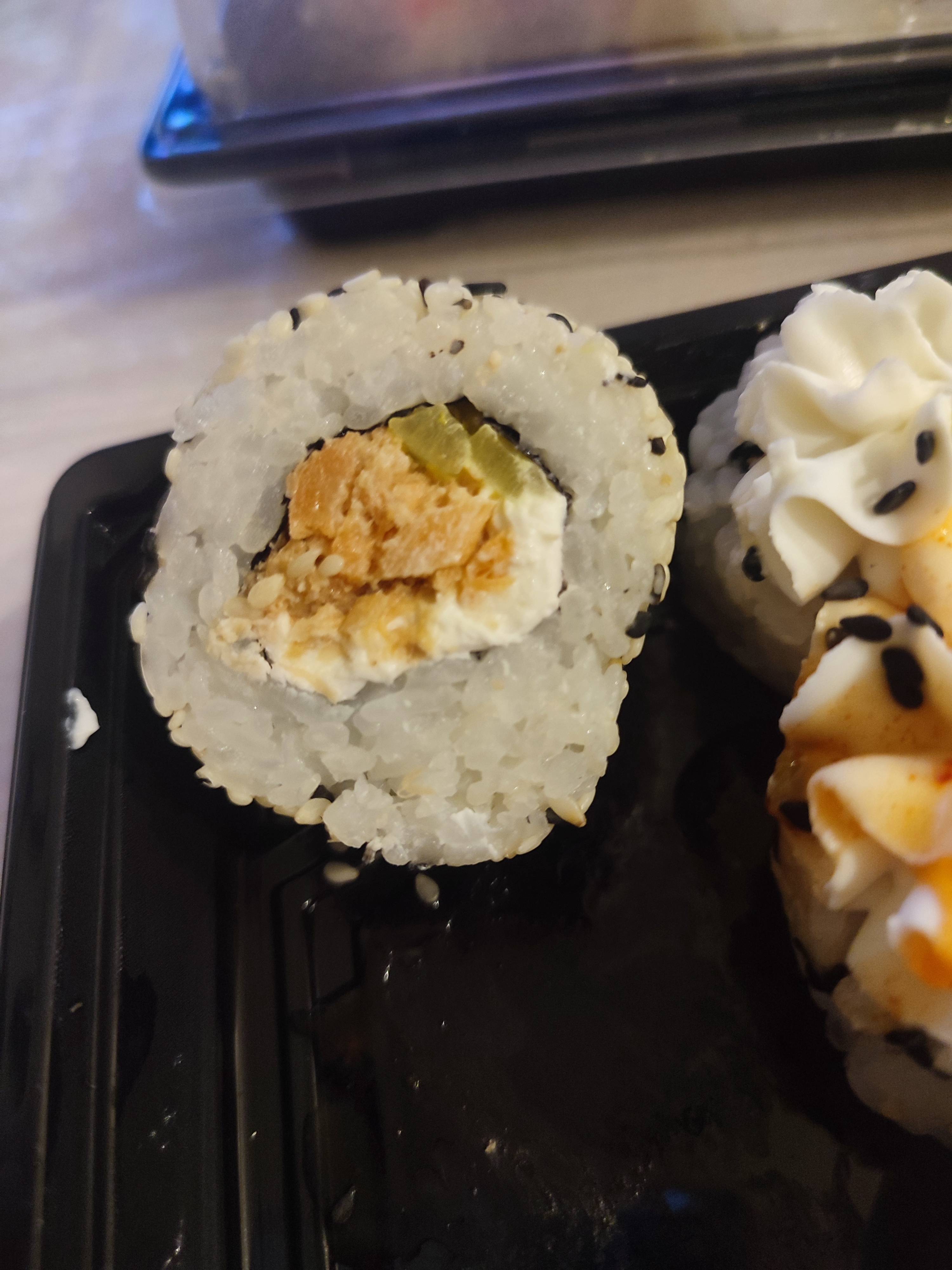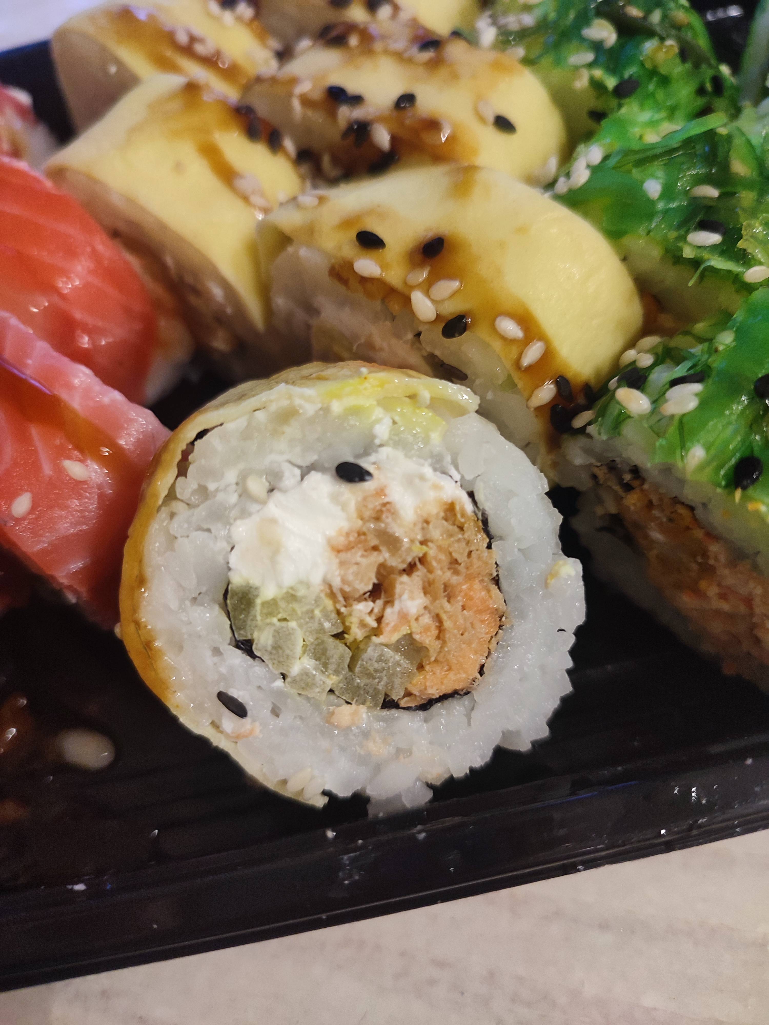Состав: тунец, такуан, сыр, нори, рис, темпура