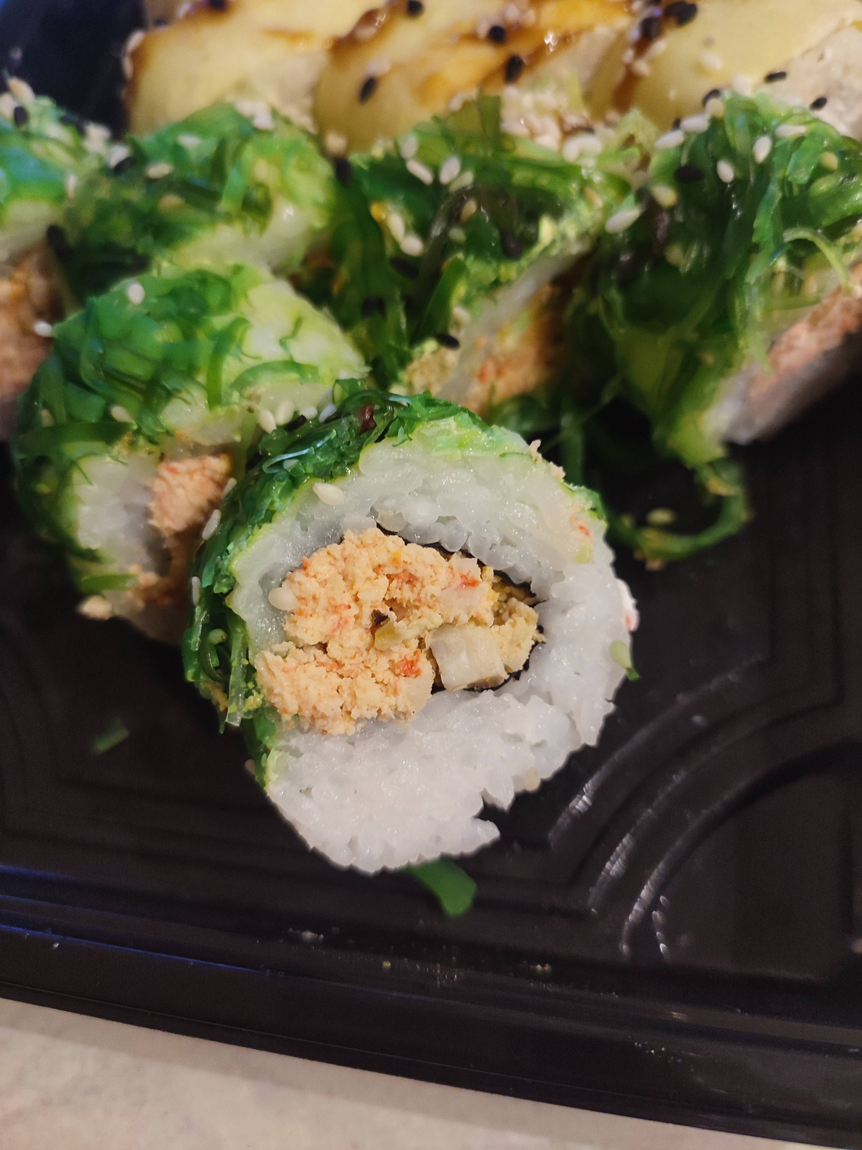 - ролл "Грин Крабс": краб-микс, имбирь, чука-салат, сыр, кунжут, нори рис - 8 шт.