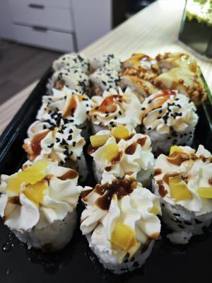 - ролл "Крем-шитаке в японском блинчике": грибы шиитаке, обжаренные в соусе терияки, крем-чиз, японский блинчик оранж, такуан, соус терияки, арахис, нори, рис - 8 шт.
