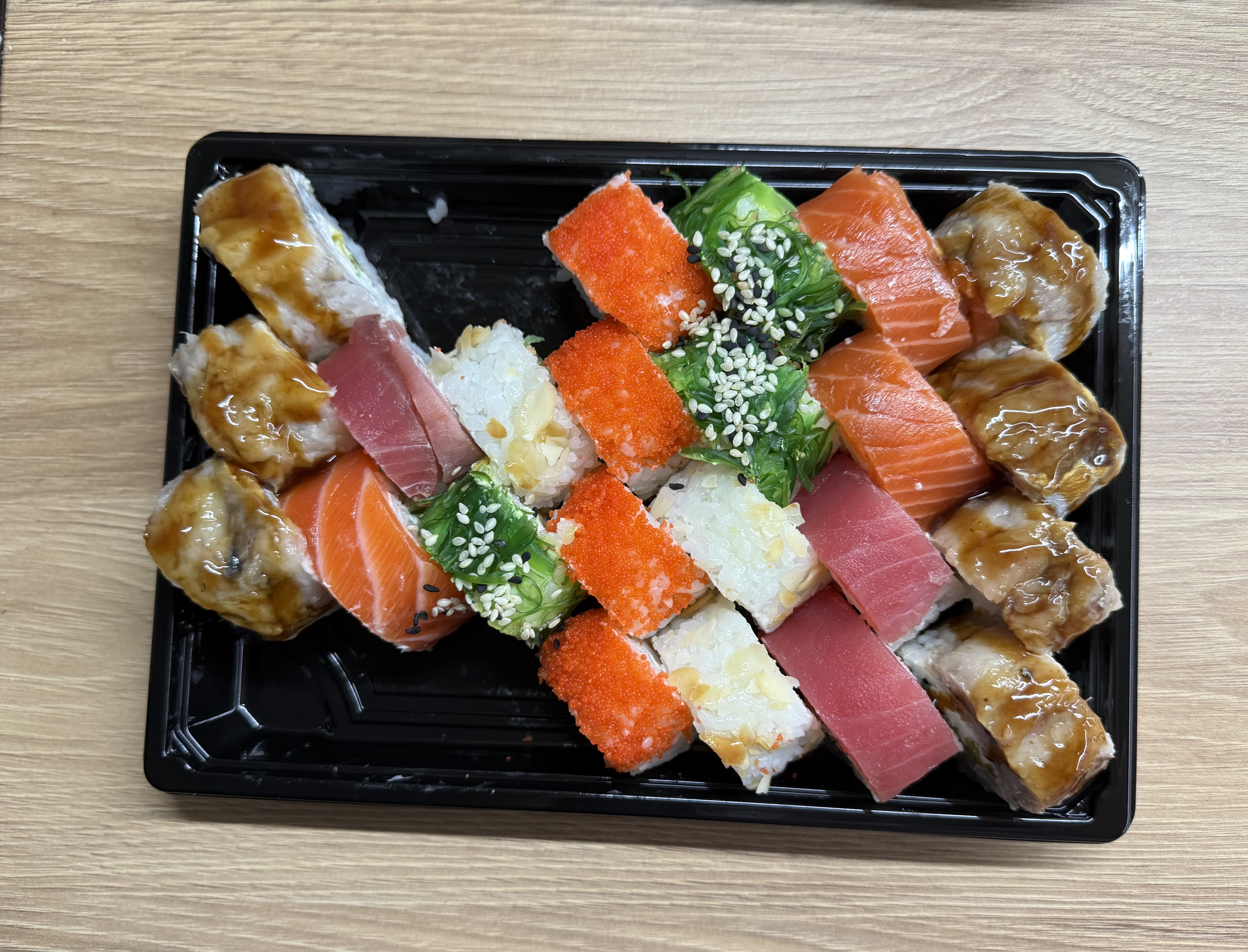 Состав: филе лосося, угорь, креветка тигровая, авокадо, огурец, сыр, рис, нори