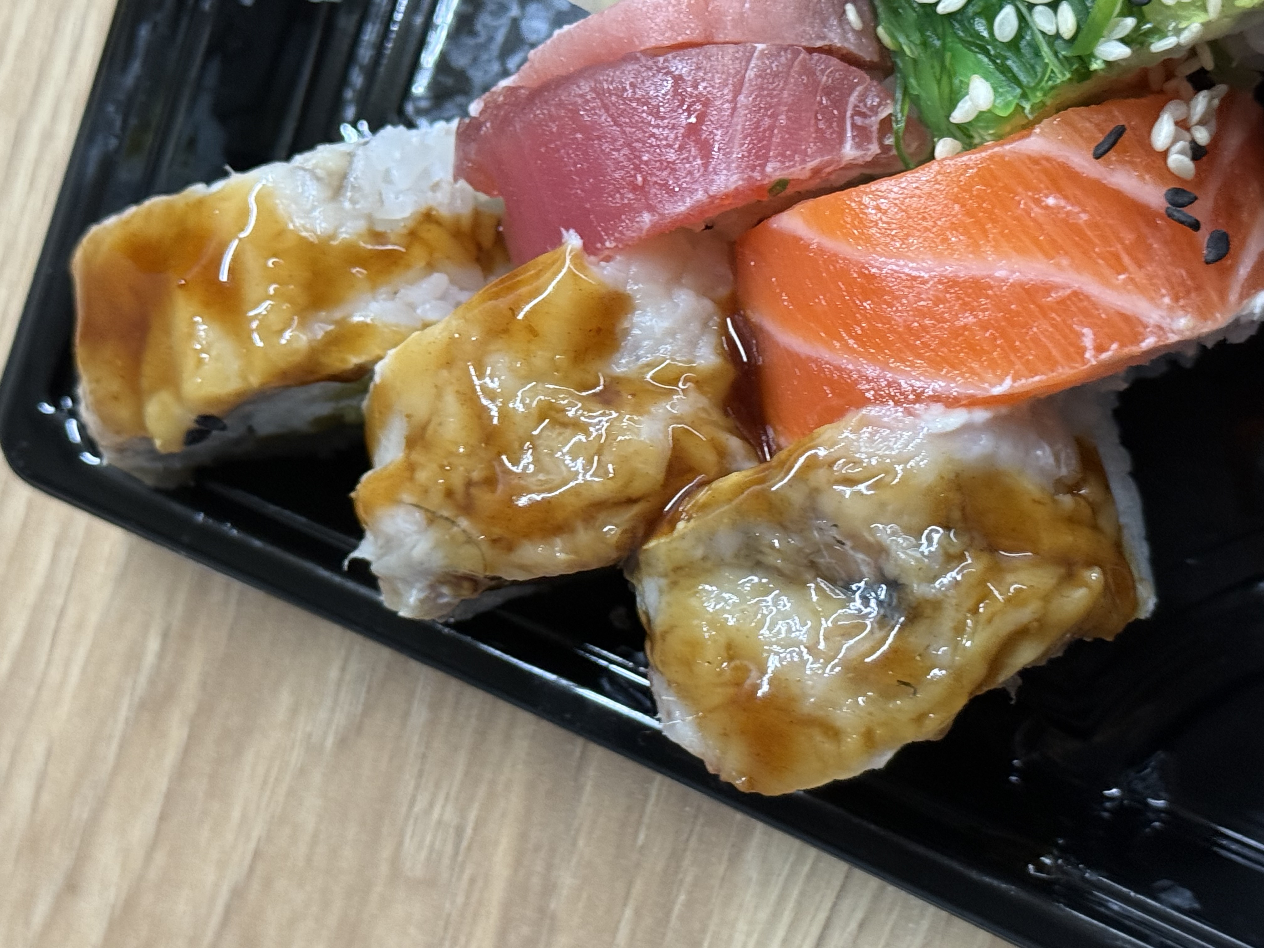 Состав: филе угря, авокадо, огурец, сыр, рис, соус терияки, кунжут