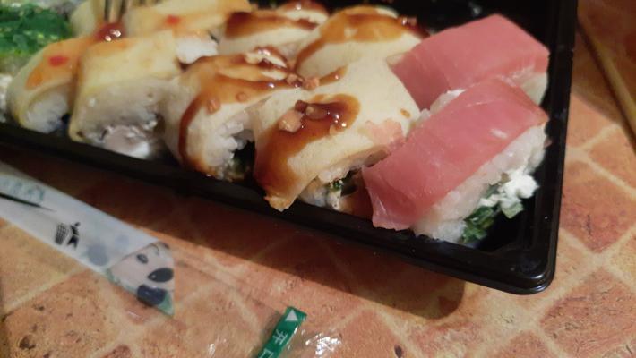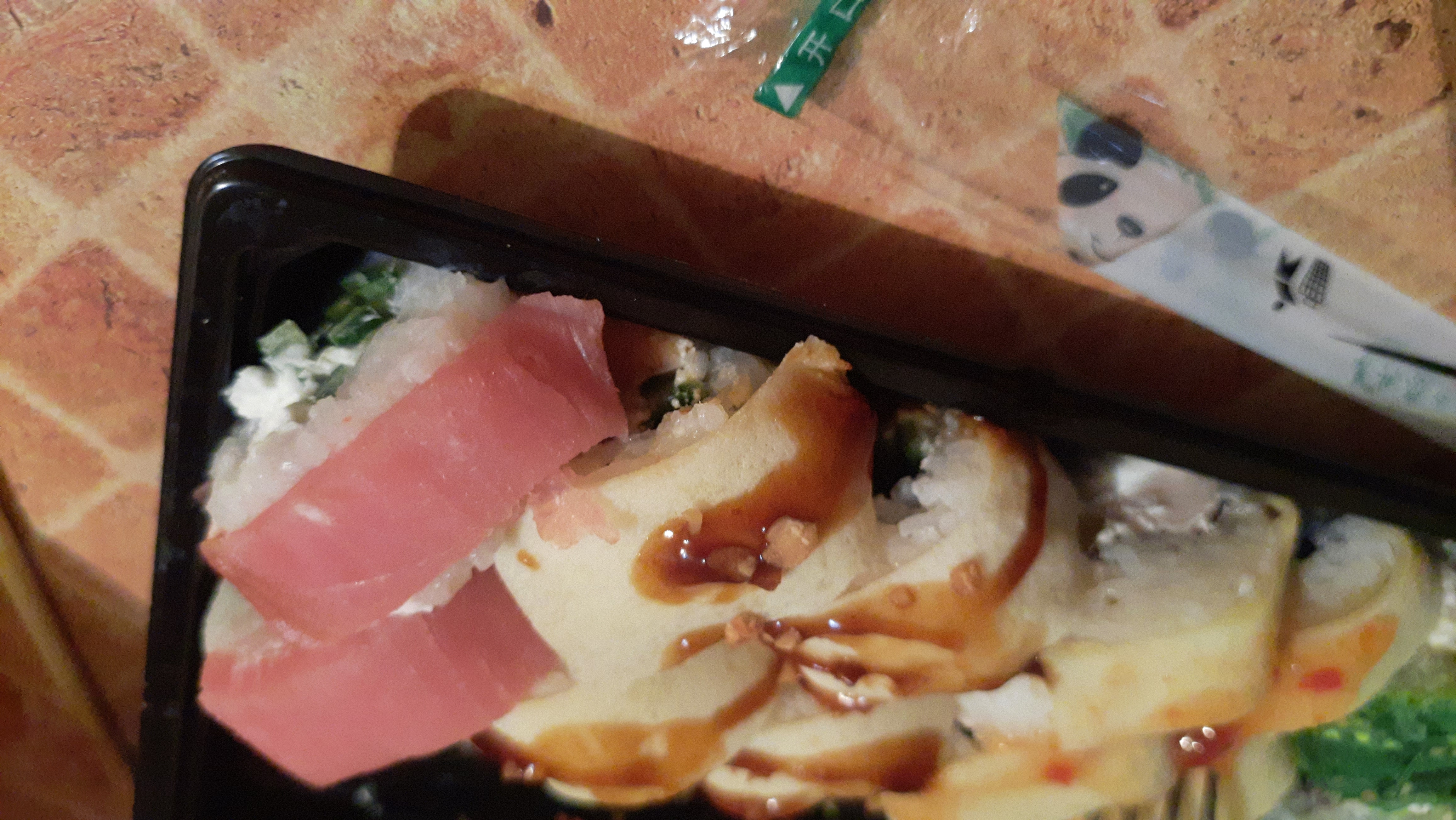 Состав: тунец, такуан, сыр, нори, рис, темпура