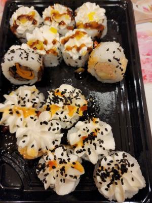 - ролл "Мидии терияки под сырной шапочкой": мидии, морковь терияки, кунжут, крем-сыр, соус терияки, нори, рис - 8 шт.
