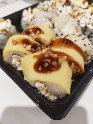 - ролл "Крем-шитаке в японском блинчике": грибы шиитаке, обжаренные в соусе терияки, крем-чиз, японский блинчик оранж, такуан, соус терияки, арахис, нори, рис - 8 шт.