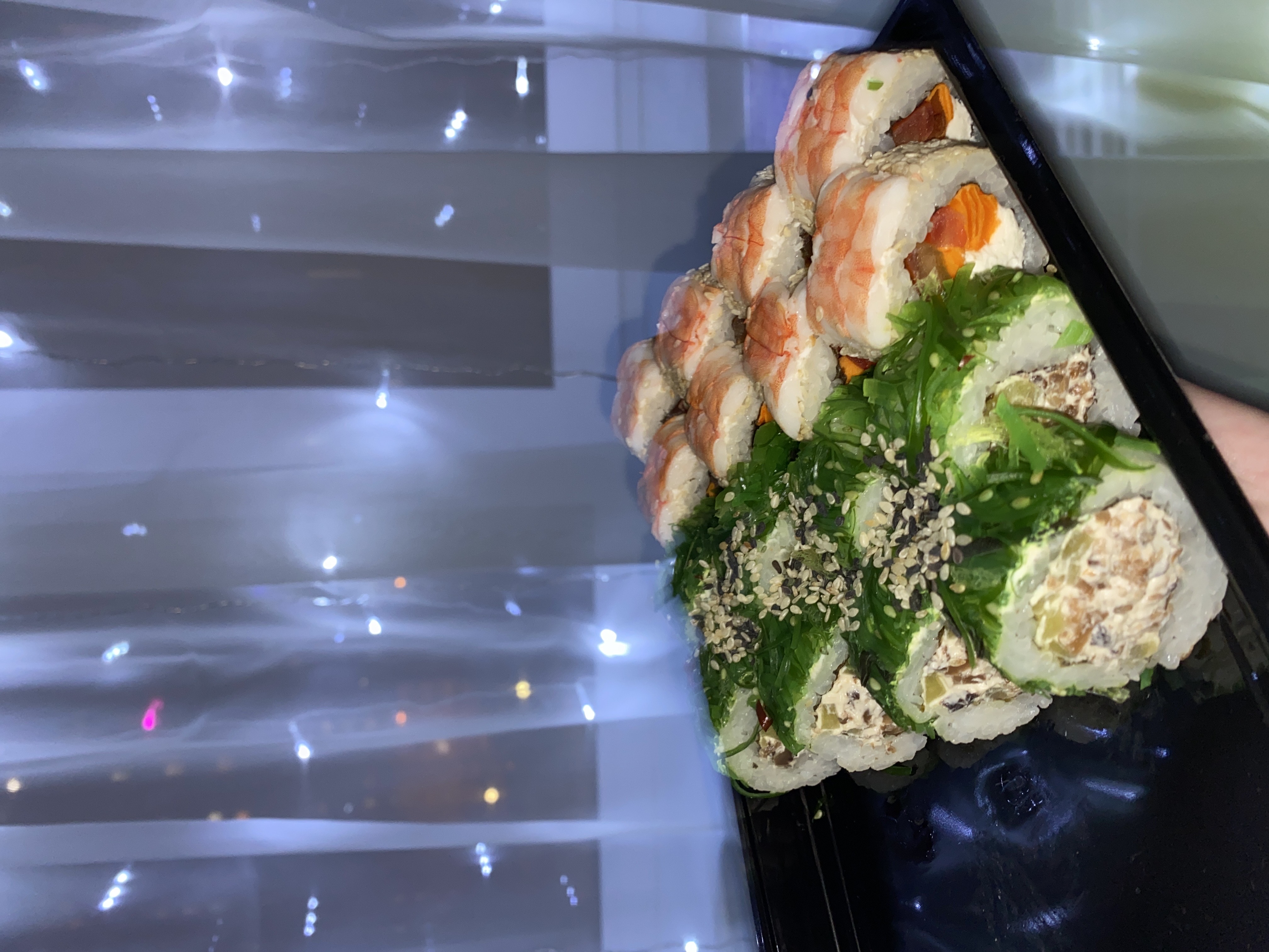Состав: филе лосося, угорь, креветка тигровая, авокадо, огурец, сыр, рис, нори