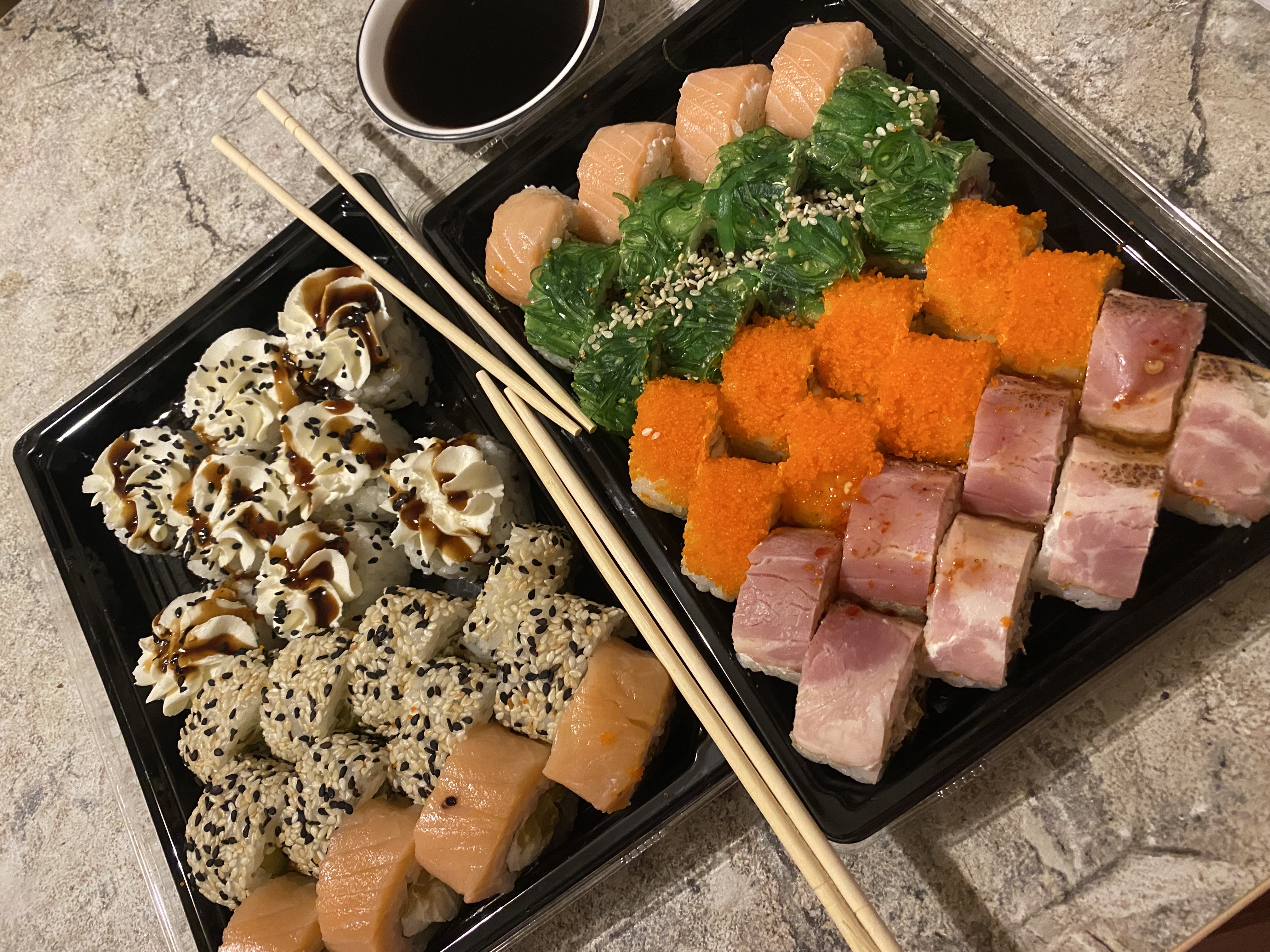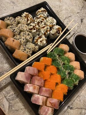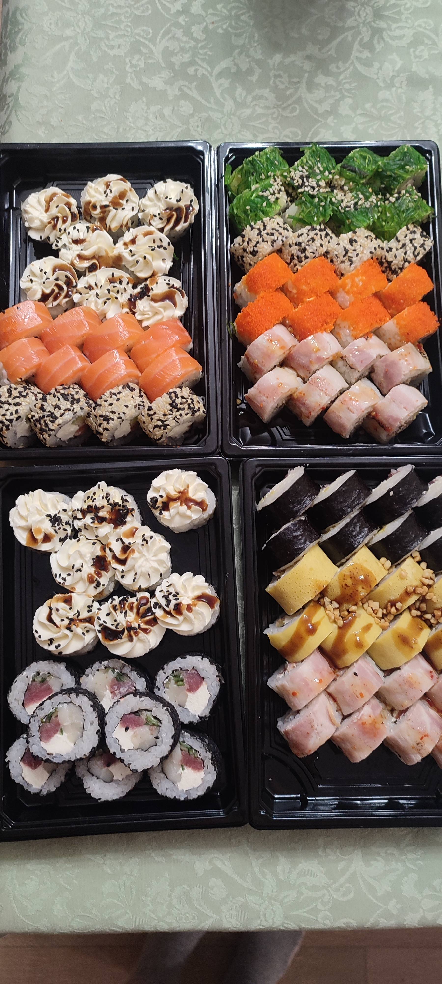 заказывали 2 сета на доставку,курьер приехал вовремя,сами суши свежие,очень много начинки. Спасибо за вкусный ужин)