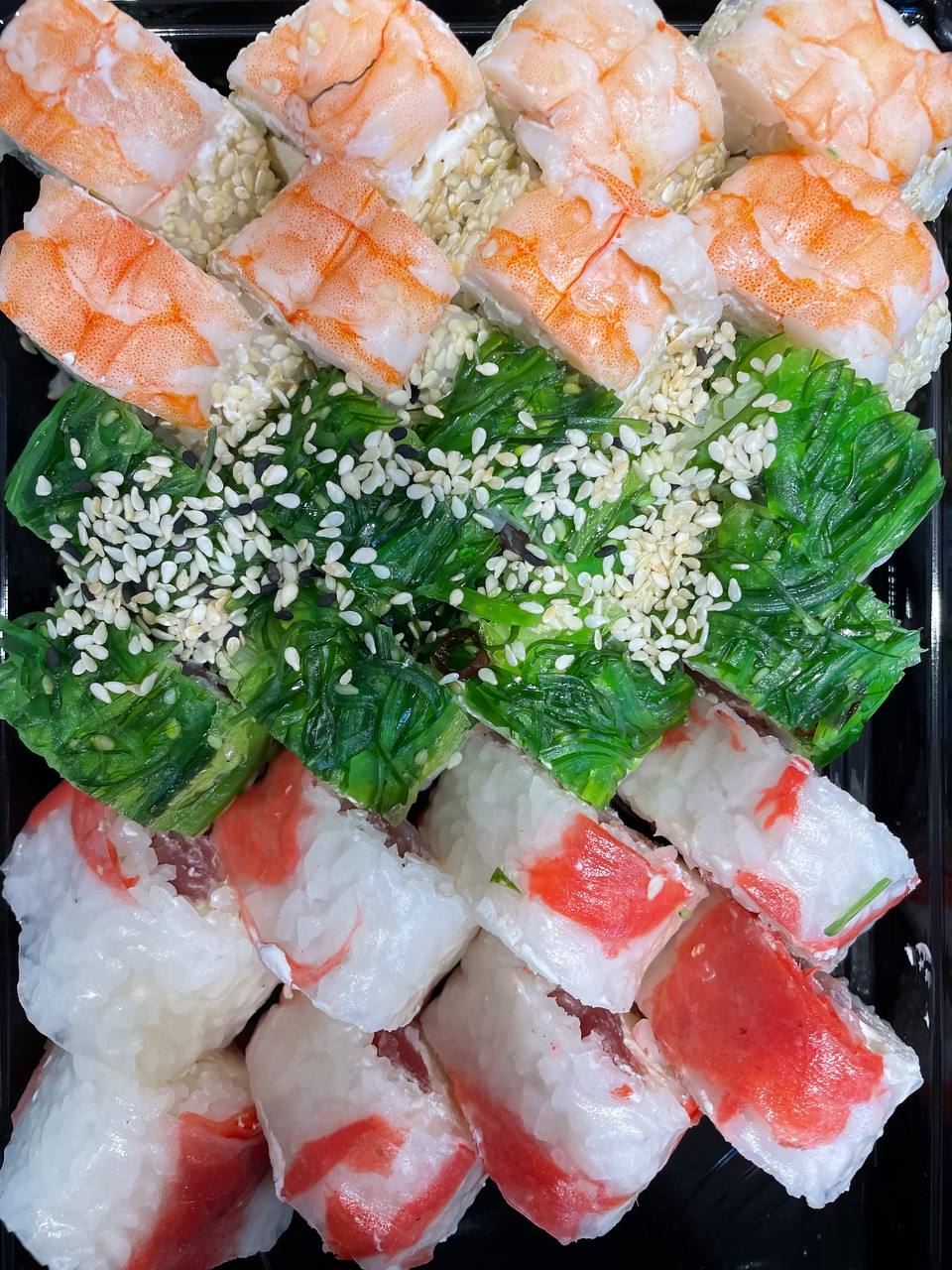 - ролл "Грин Эби Кроунинг": креветка тигровая, краб-микс, чука-салат, сыр, кунжут, нори, рис - 8 шт.