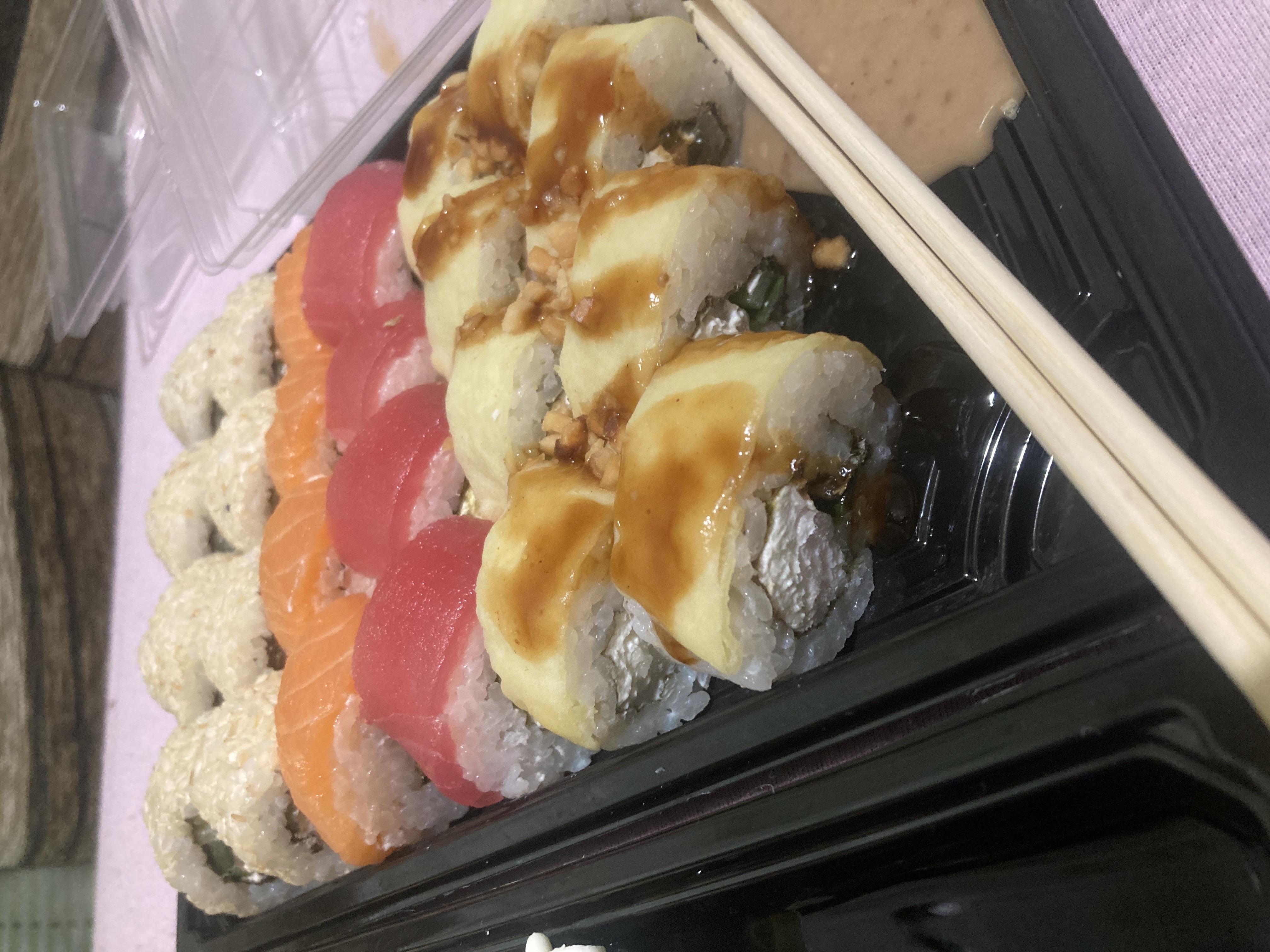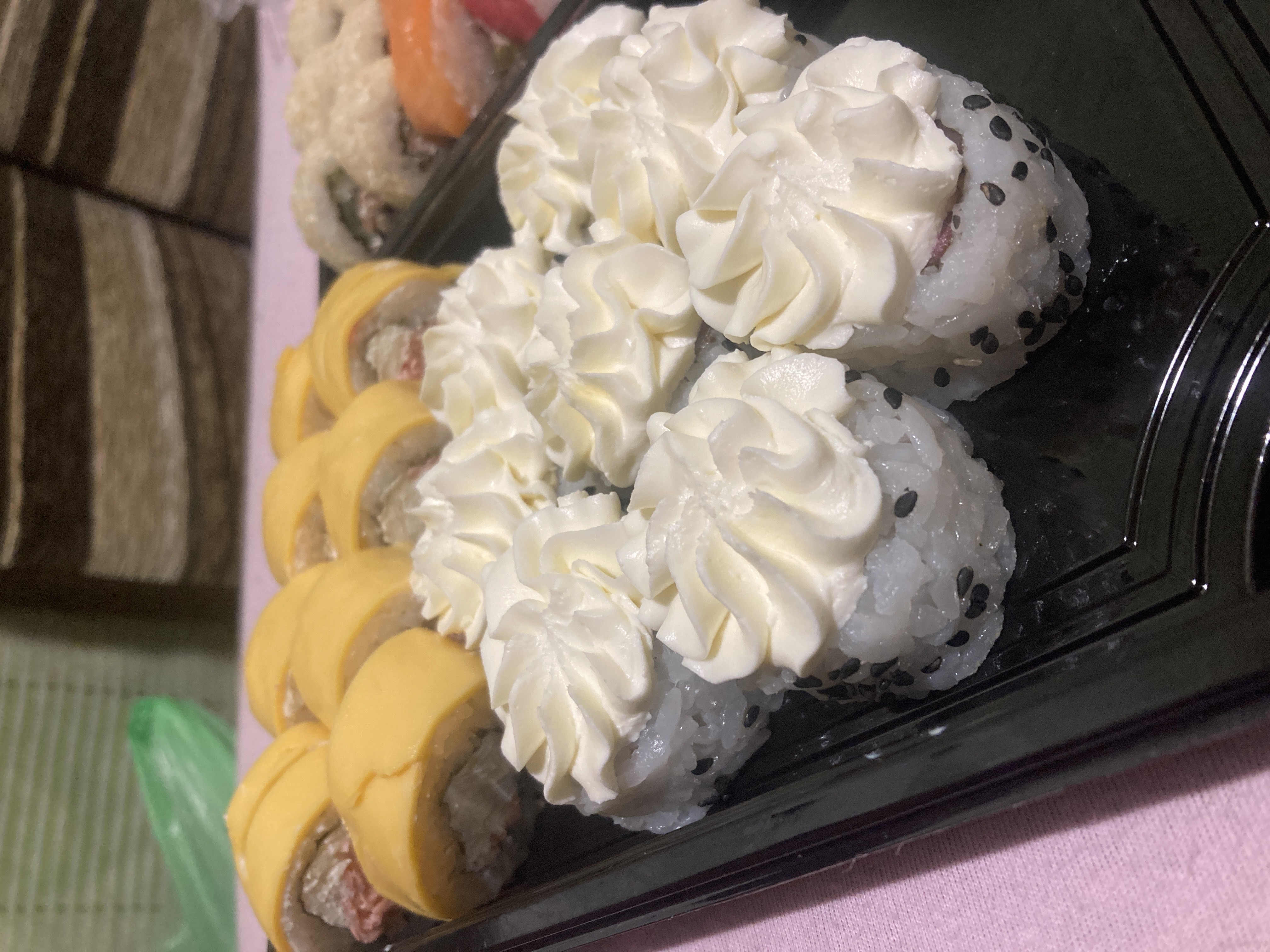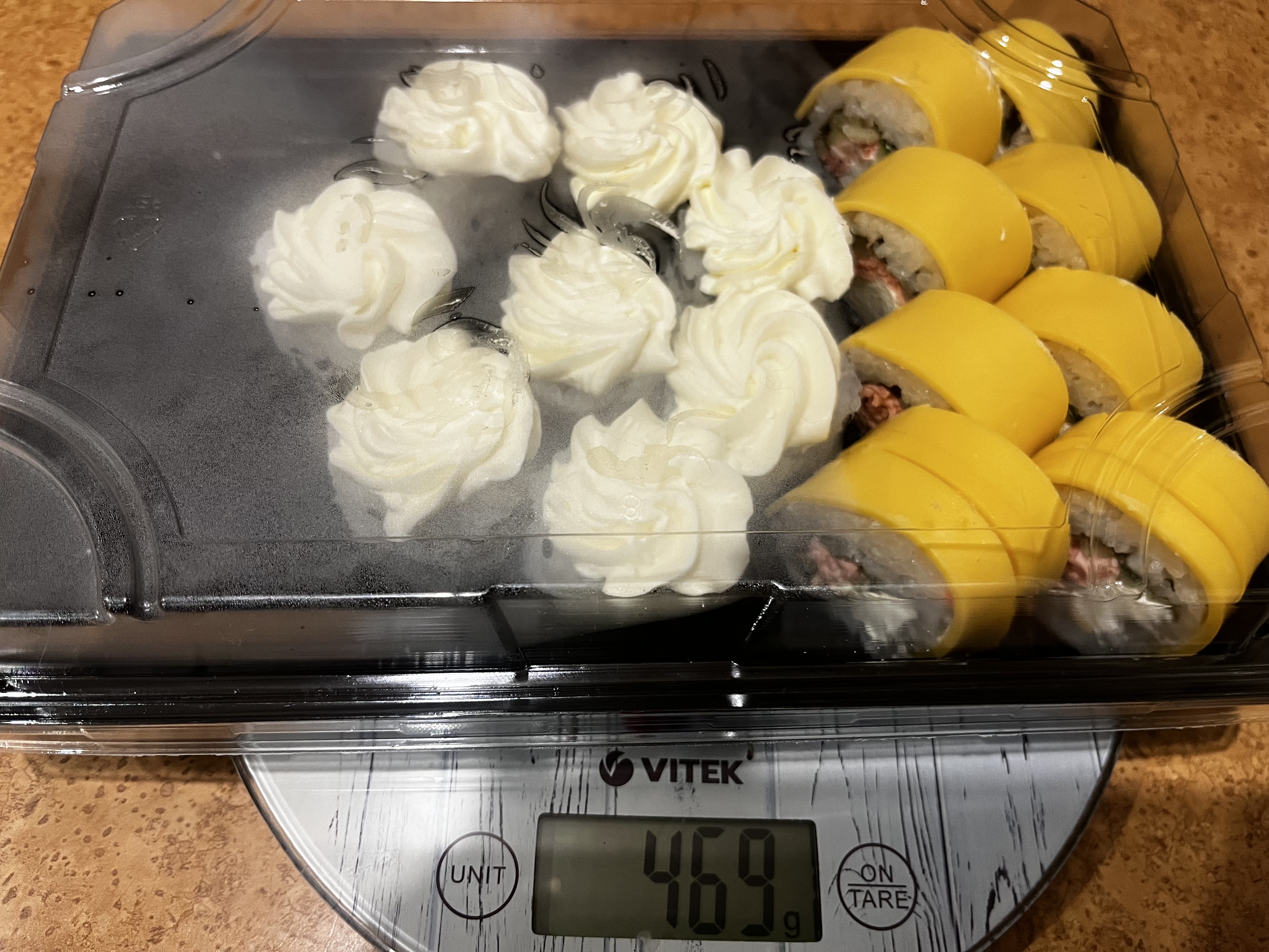 Состав: тунец, такуан, сыр, нори, рис, темпура