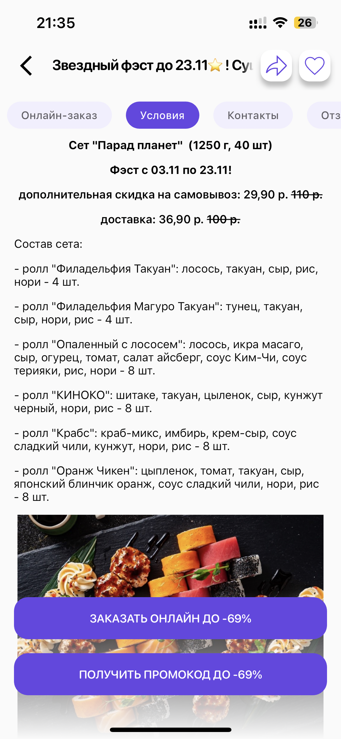 - Промокод дает право на скидку до 67% на суши-сеты от "ArtSushi"