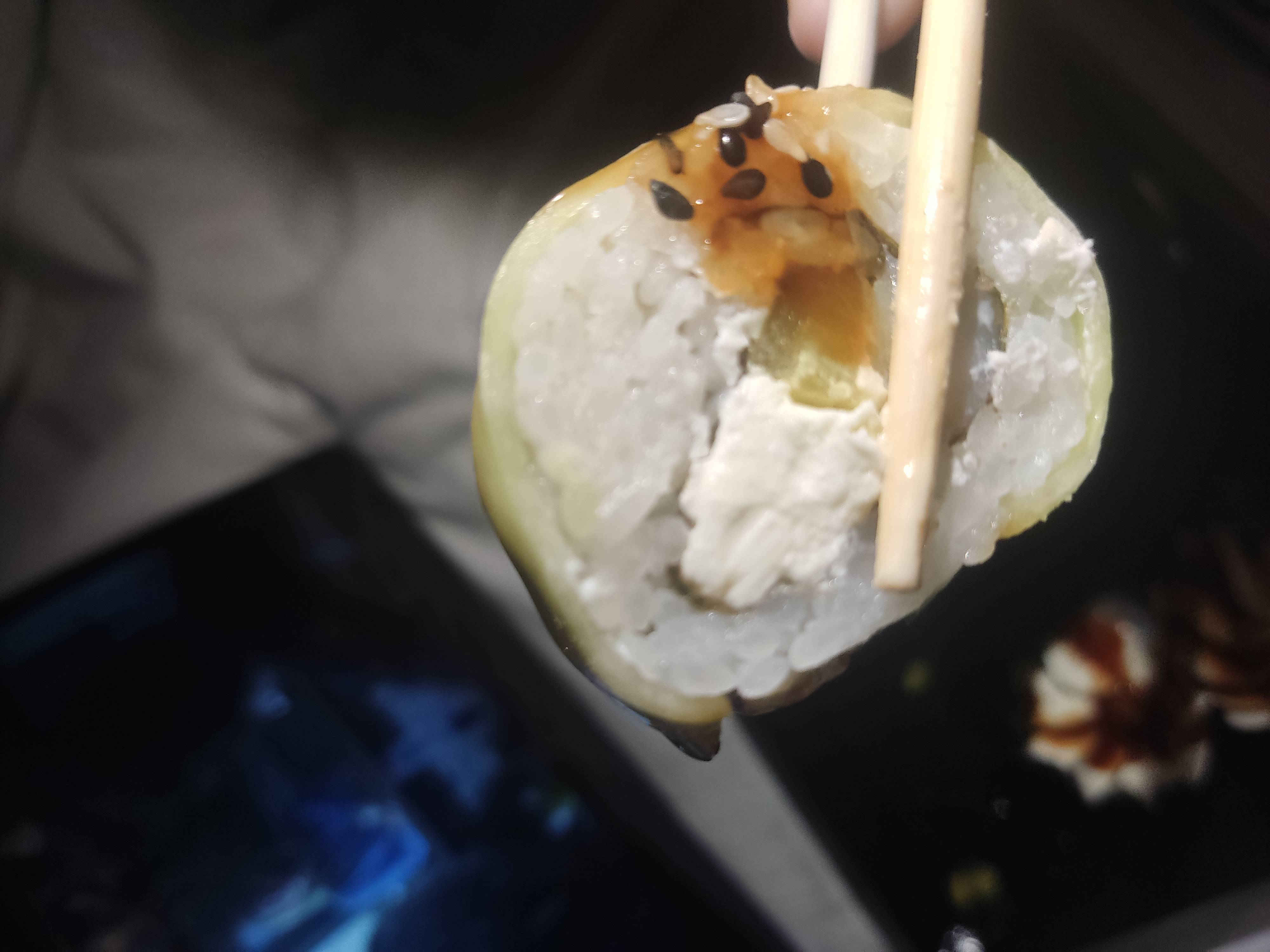 Состав: филе угря, авокадо, огурец, сыр, рис, соус терияки, кунжут