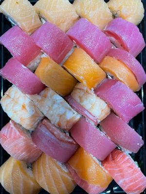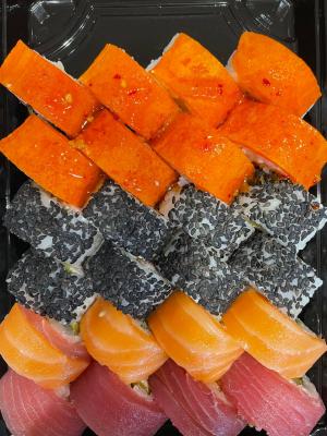 Состав: филе лосося, угорь, креветка тигровая, авокадо, огурец, сыр, рис, нори